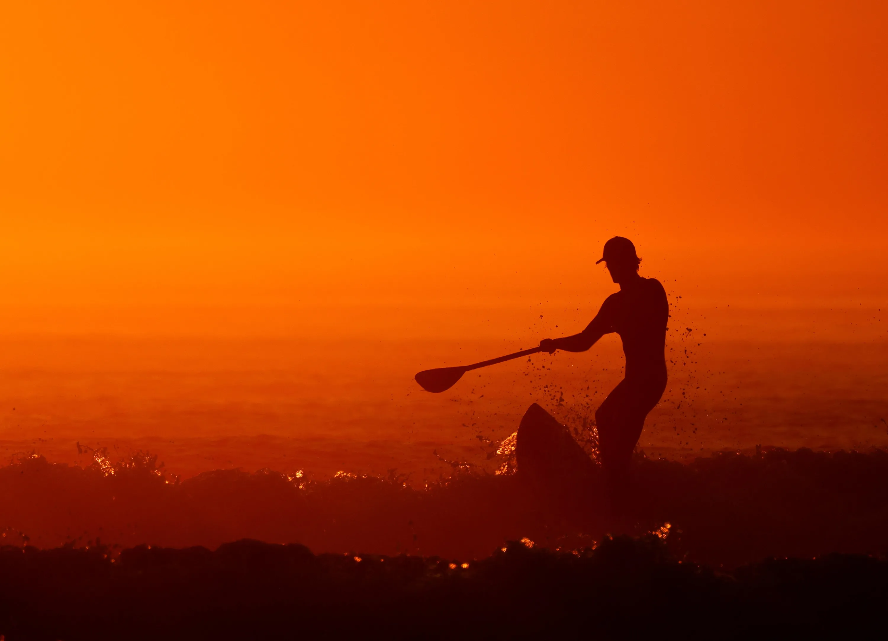A man on a paddle board surfs during sunset at La Torche, as a heat wave hits France, in Plomeur, Brittany, France, September 6, 2021. (Photo by Pascal Rossignol/Reuters)