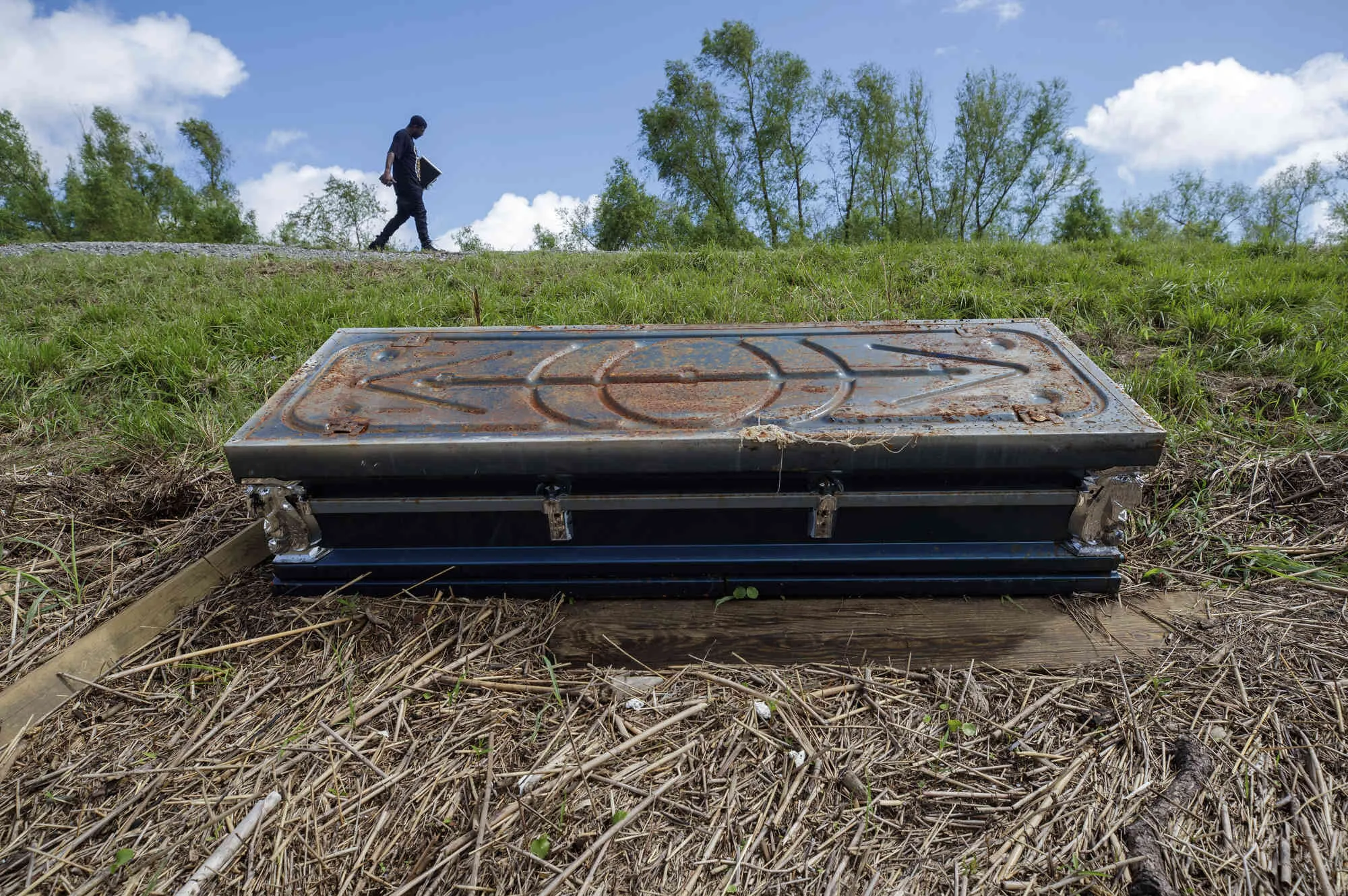 Jeremy Salvant walks on the Mississippi River levee to avoid snakes and passing the casket of John Chaney, after rescuing family photographs from his mold filled destroyed home in Ironton, La., Sunday, September 19, 2021, three weeks after the wind and storm surge from Hurricane Ida devastated the historic African American community in Plaquemines Parish. (Photo by David Grunfeld/The Times-Picayune/The New Orleans Advocate via AP Photo)
