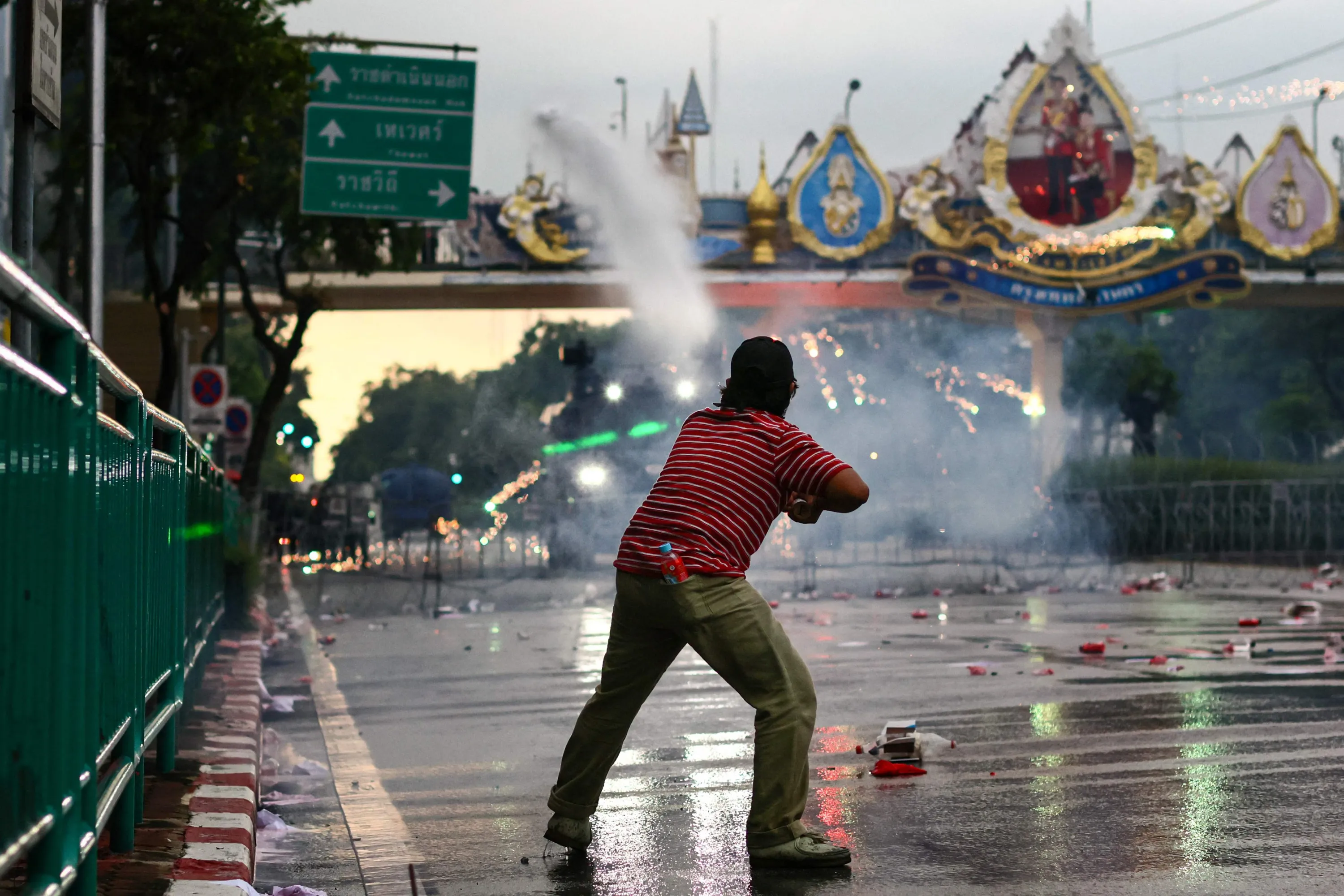An anti-government protester launches a firework at the police during a demonstration in Bangkok on September 27, 2021, as activists call for the resignation of Thailand's Prime Minister Prayut Chan-O-Cha over the government's handling of the Covid-19 coronavirus crisis. (Photo by Jack Taylor/AFP Photo)