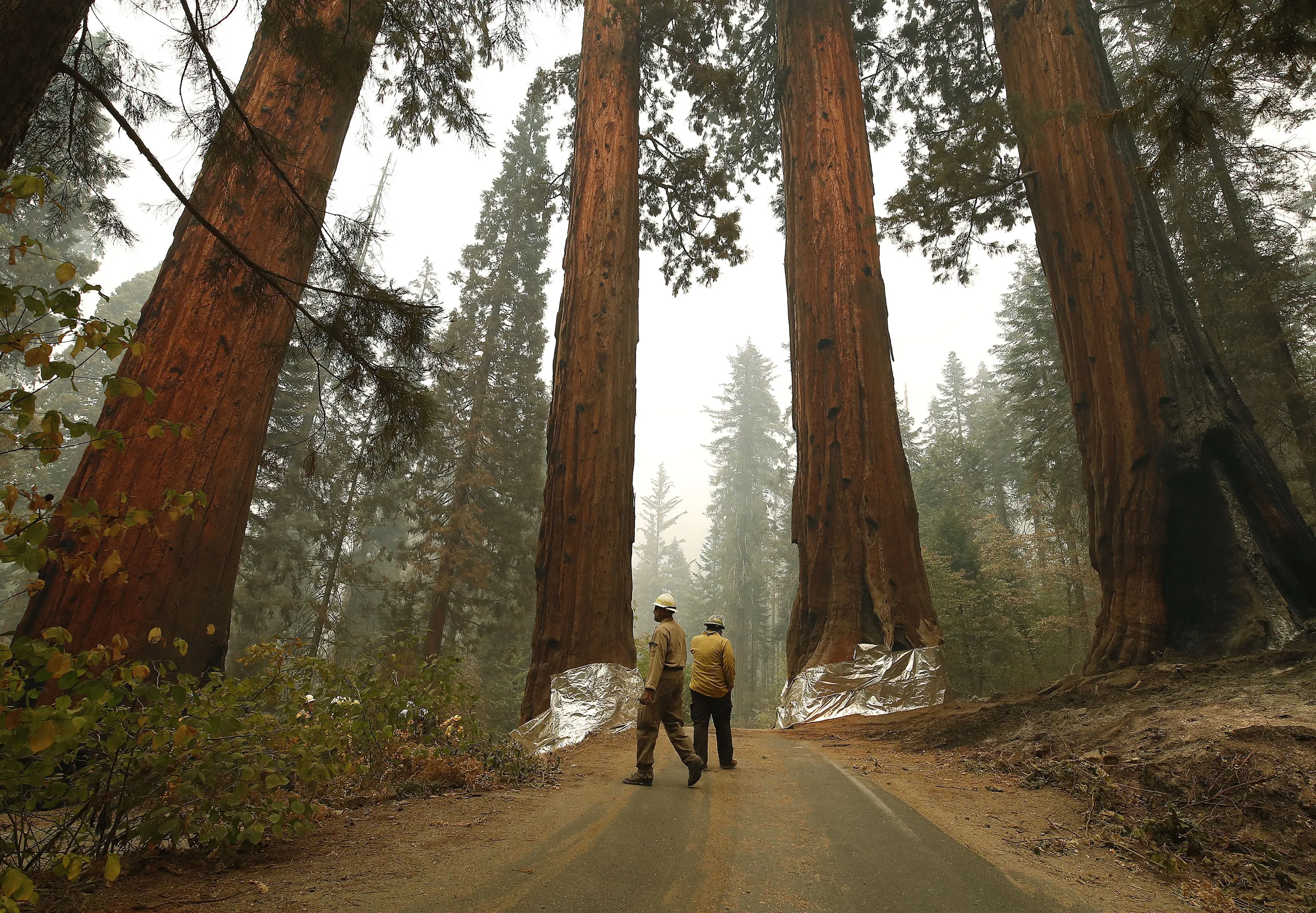 Ed Christopher, left, Deputy Fire Director at U.S. Fish and Wildlife Service, looks over the Four Guardsmen at the entrance to General Sherman at Sequoia National Park, Calif., Wednesday, September 22, 2021. The Four Guardsmen were wrapped by structure wrap to protect them from fires along with General Sherman. (Photo by Gary Kazanjian/AP Photo)