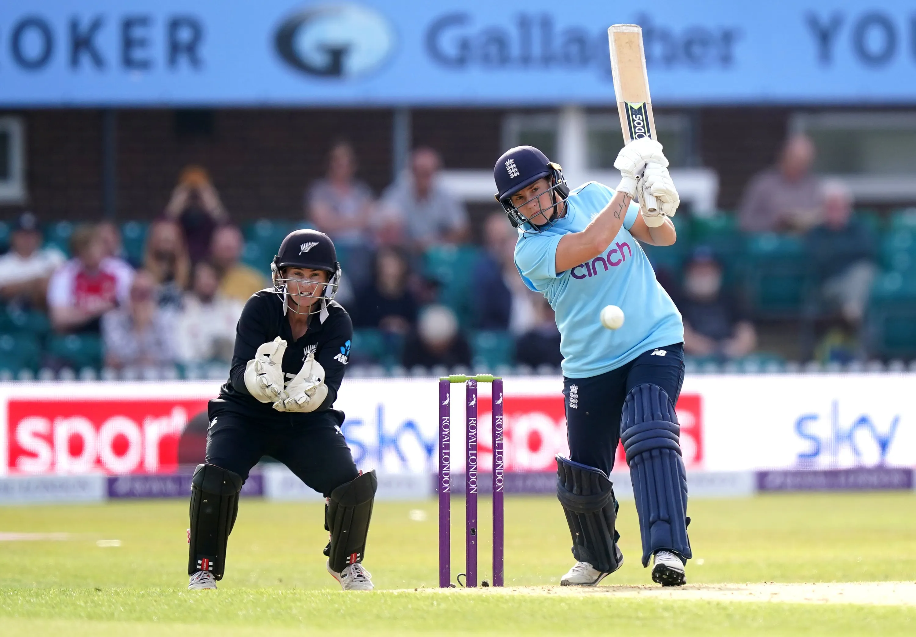 England's Katherine Brunt bats during the third ODI at Uptonsteel County Ground, Leicester on Tuesday, September 21, 2021. (Photo by Mike Egerton/PA Images via Getty Images)