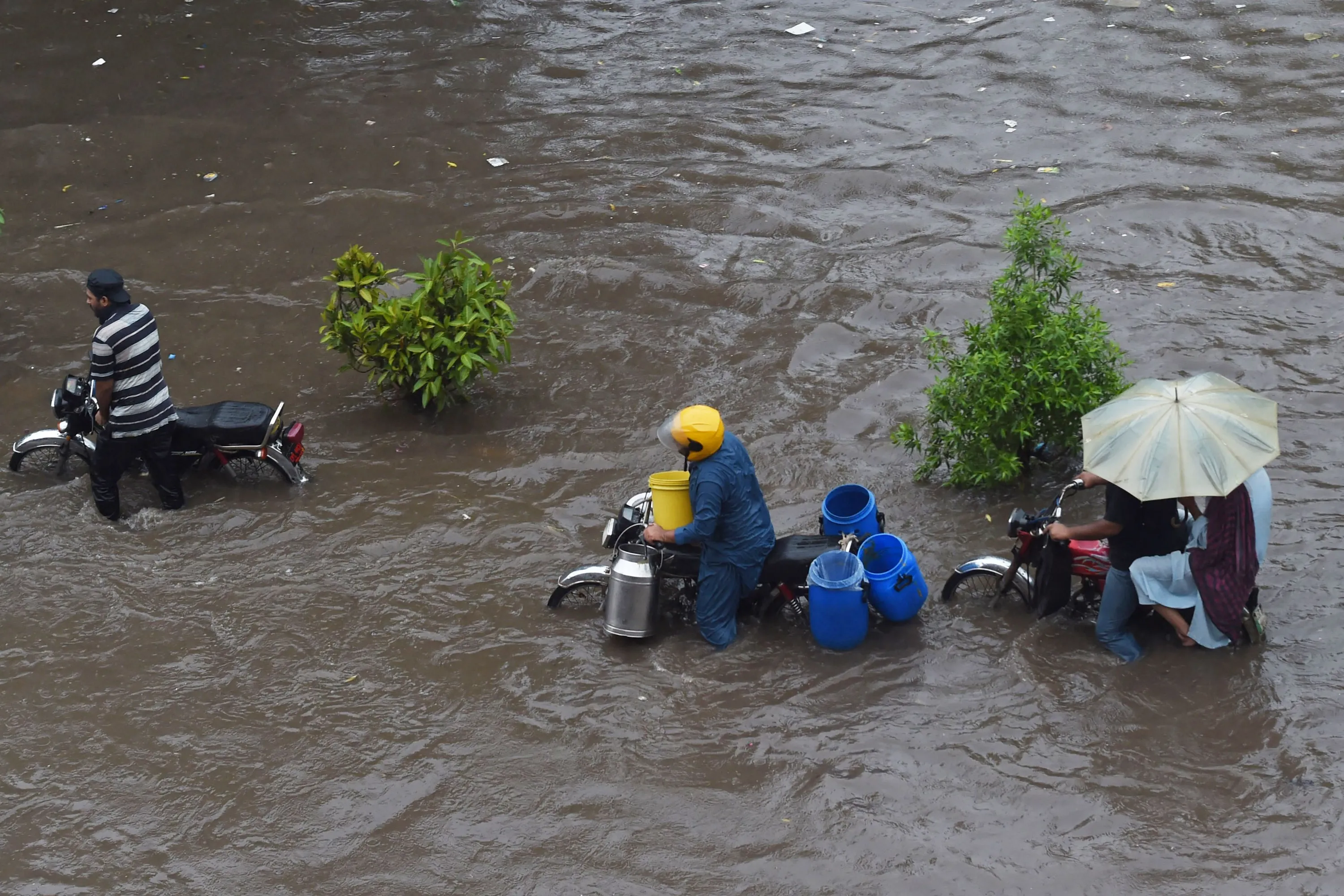 Commuters wade through a flooded street after a heavy rain shower in Lahore on September 10, 2021. (Photo by Arif Ali/AFP Photo)