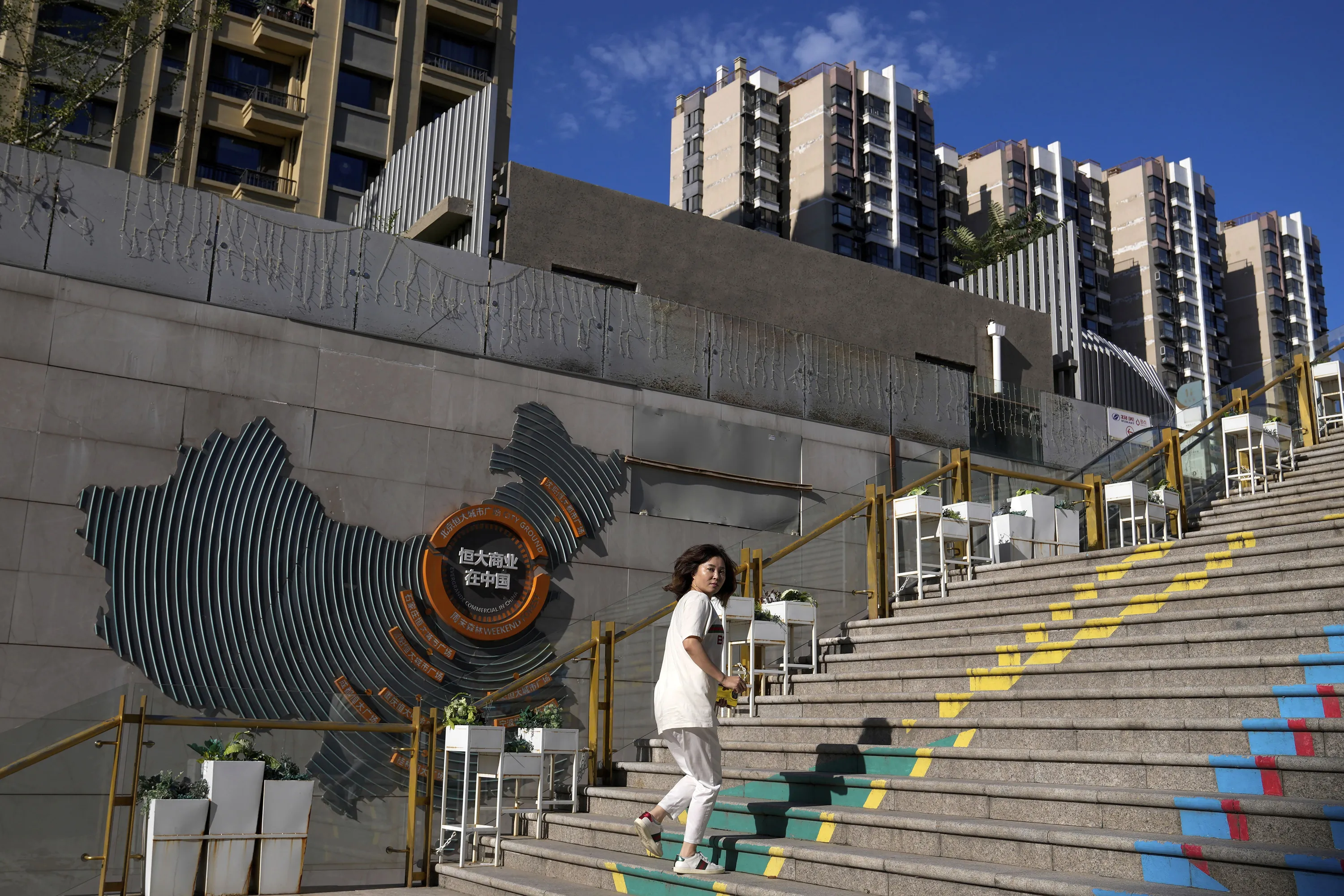 A woman looks back as she walks by a map showing Evergrande development projects with its apartment buildings seen behind, at an Evergrande city plaza in Beijing, Tuesday, September 21, 2021. Global investors are watching nervously as the Evergrande Group, one of China's biggest real estate developers, struggles to avoid defaulting on tens of billions of dollars of debt, fueling fears of possible wider shock waves for the Chinese financial system. (Photo by Andy Wong/AP Photo)