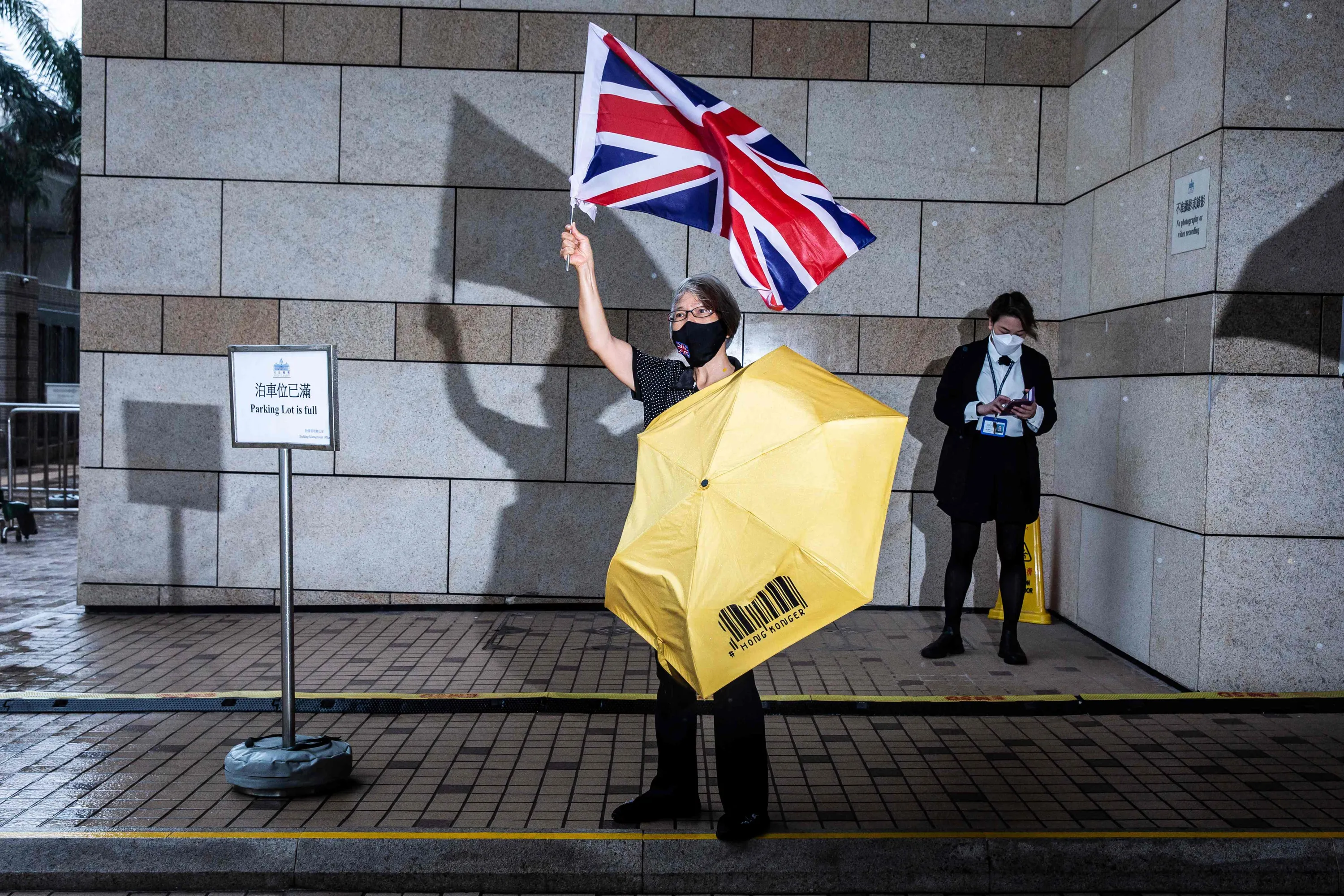 Pro-democracy activist Alexandra Wong (C) holds up a Union Jack flag outside West Kowloon court in Hong Kong on September 23, 2021, where 47 pro-democracy defendents appear in court charged with conspiracy to commit subversion under the Beijing enacted national security law. (Photo by Isaac Lawrence/AFP Photo)