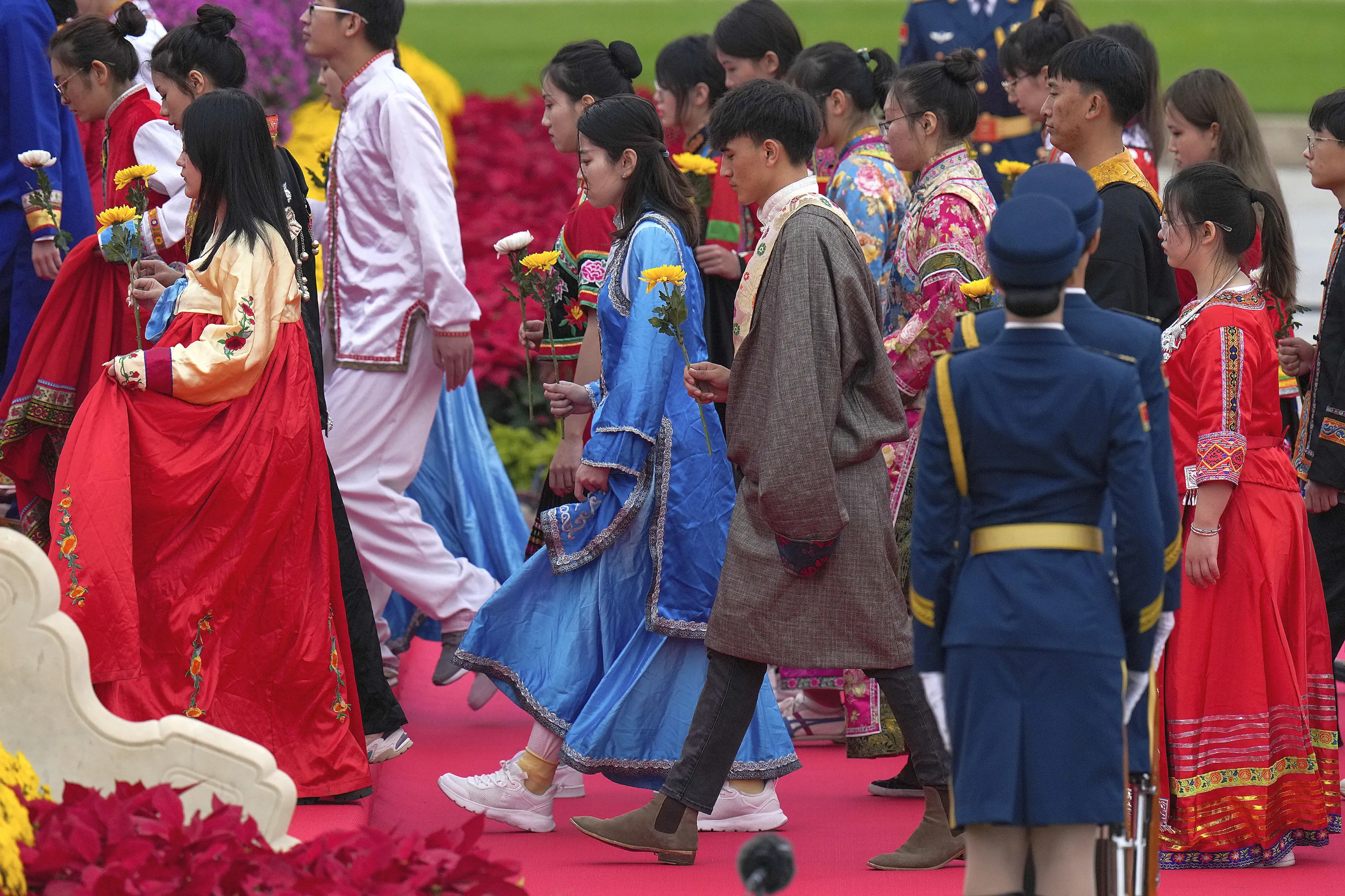 Attendees wearing traditional costumes walk with flowers as they head to pay respects to the People's Heroes Monument during a ceremony to mark Martyr's Day at Tiananmen Square in Beijing, Thursday, September 30, 2021. Chinese President Xi Jinping paid respects at a solemn commemoration Thursday for those who died in the struggle to establish Communist Party rule, as he leads a national drive to reinforce patriotism and single-party authority. (Photo by Andy Wong/AP Photo)