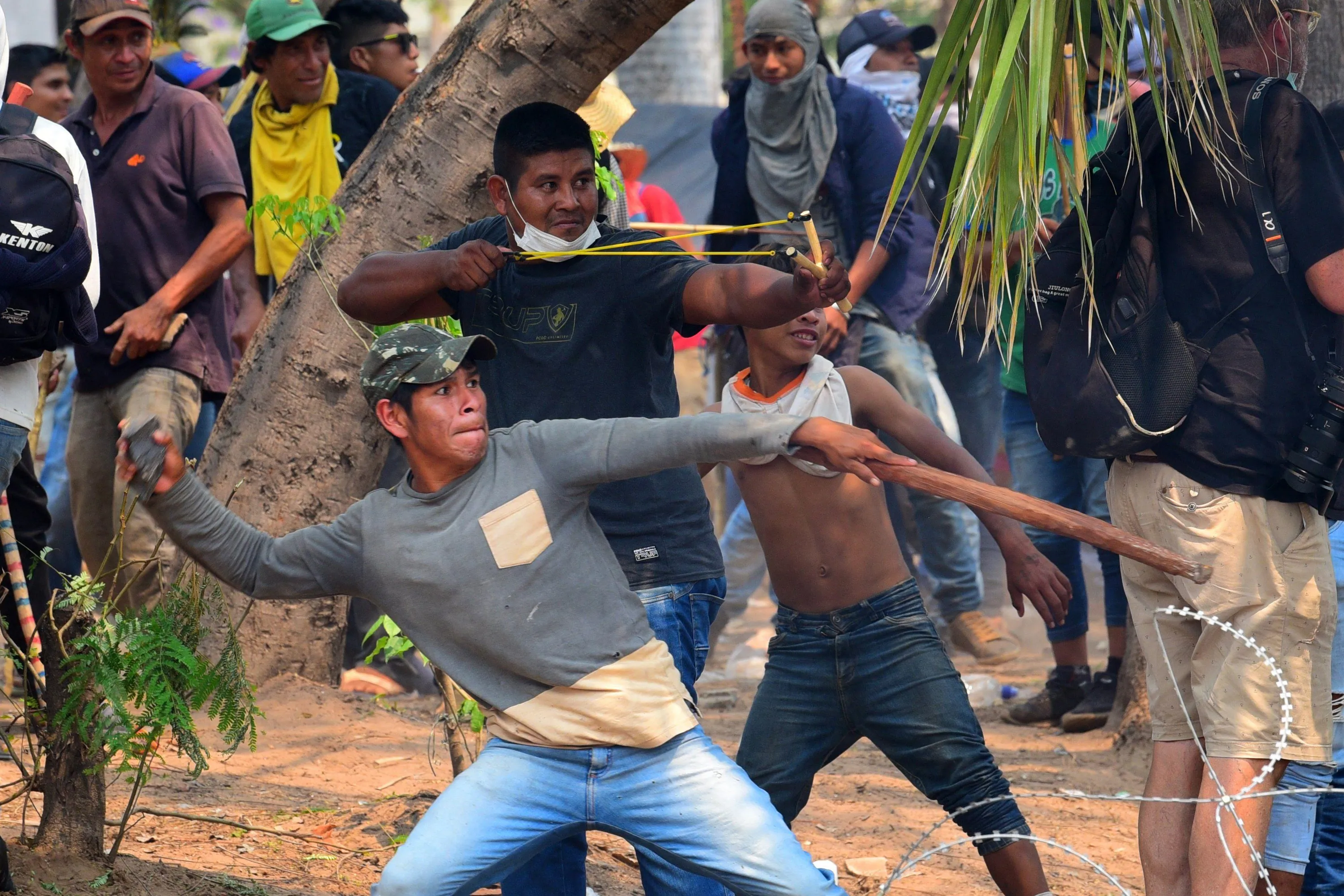 A man throws a stone as another one uses a sling during an indigenous protest against a bill being debated in congress which establishes punishment for land invasion, outside the Congress building in Asuncion, on September 29, 2021. (Photo by Norberto Duarte/AFP Photo)