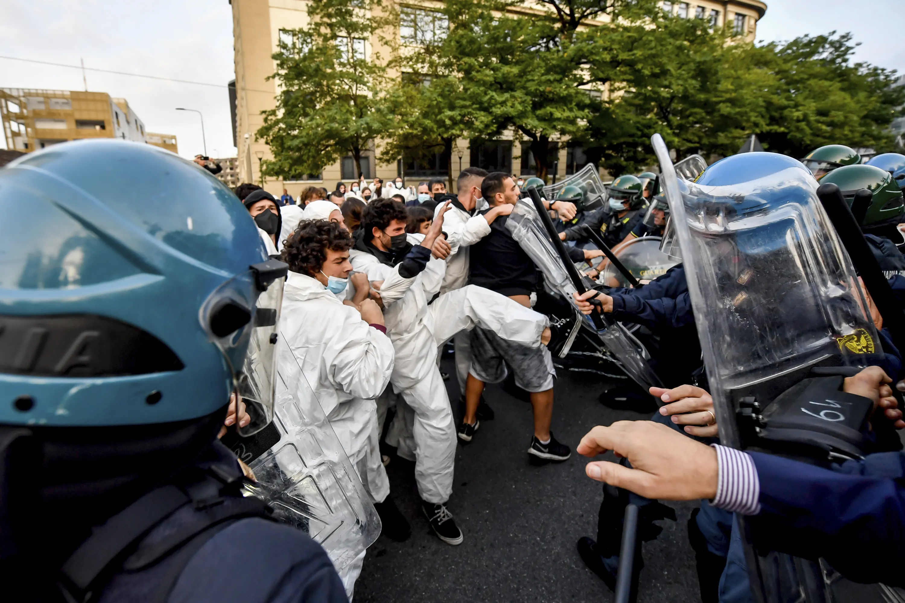 Clashes in Milan, Italy on September 30, 2021 between police and Extinction Rebellion activists who blocked traffic in front of the MiCo, the Milan Convention Center in the Fiera area, where PreCop 26 on climate change begins today. (Photo by Claudio Furlan/Zuma via AP Photo)