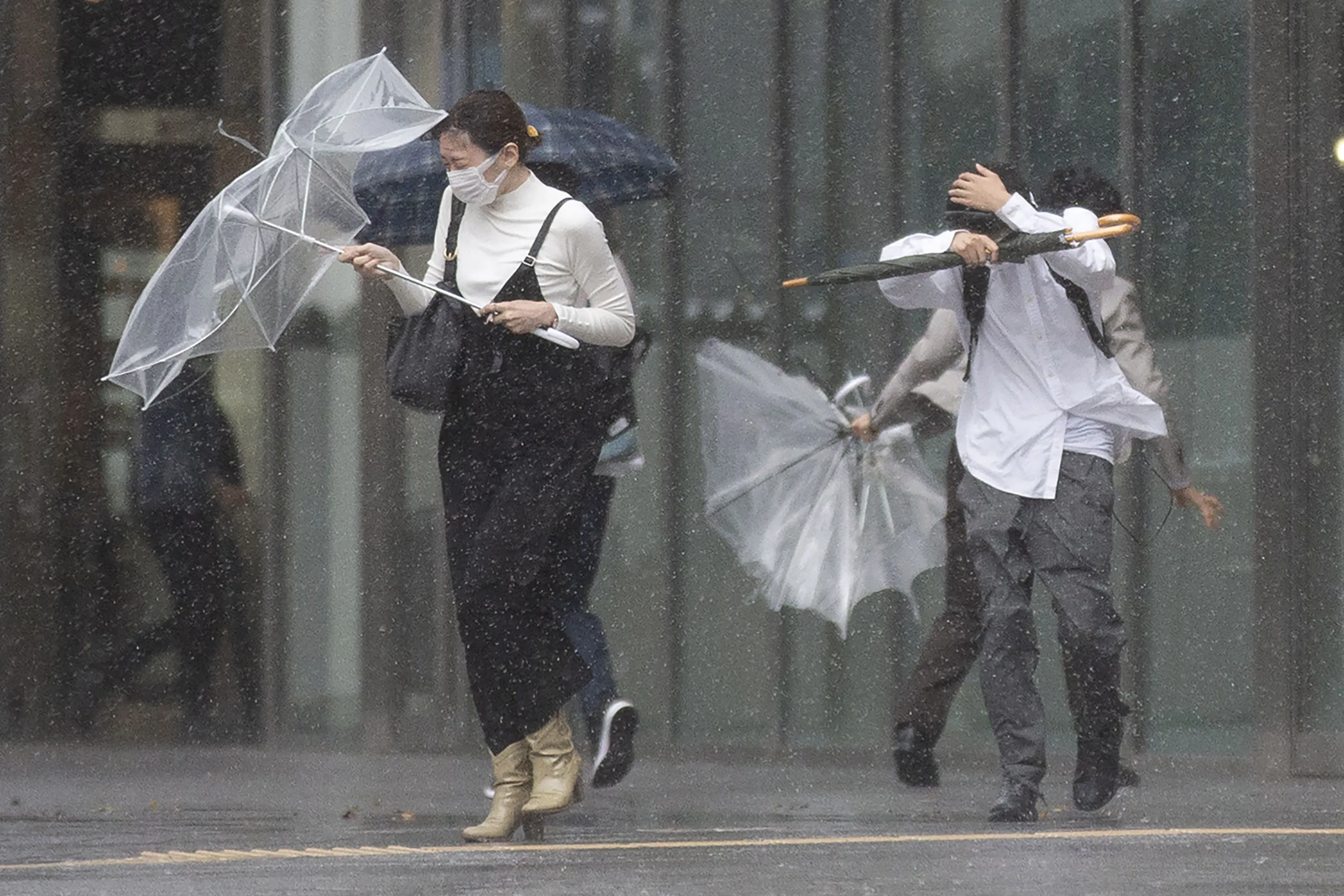 People struggle with rain and strong wind as Typhoon Mindulle travels off the coast of Japan Friday, October 1, 2021, in Tokyo. A powerful typhoon is pounding Japan and some of its eastern islands with gusts and downpours of rain, grounding some domestic flights and halting trains. (Photo by Kiichiro Sato/AP Photo)