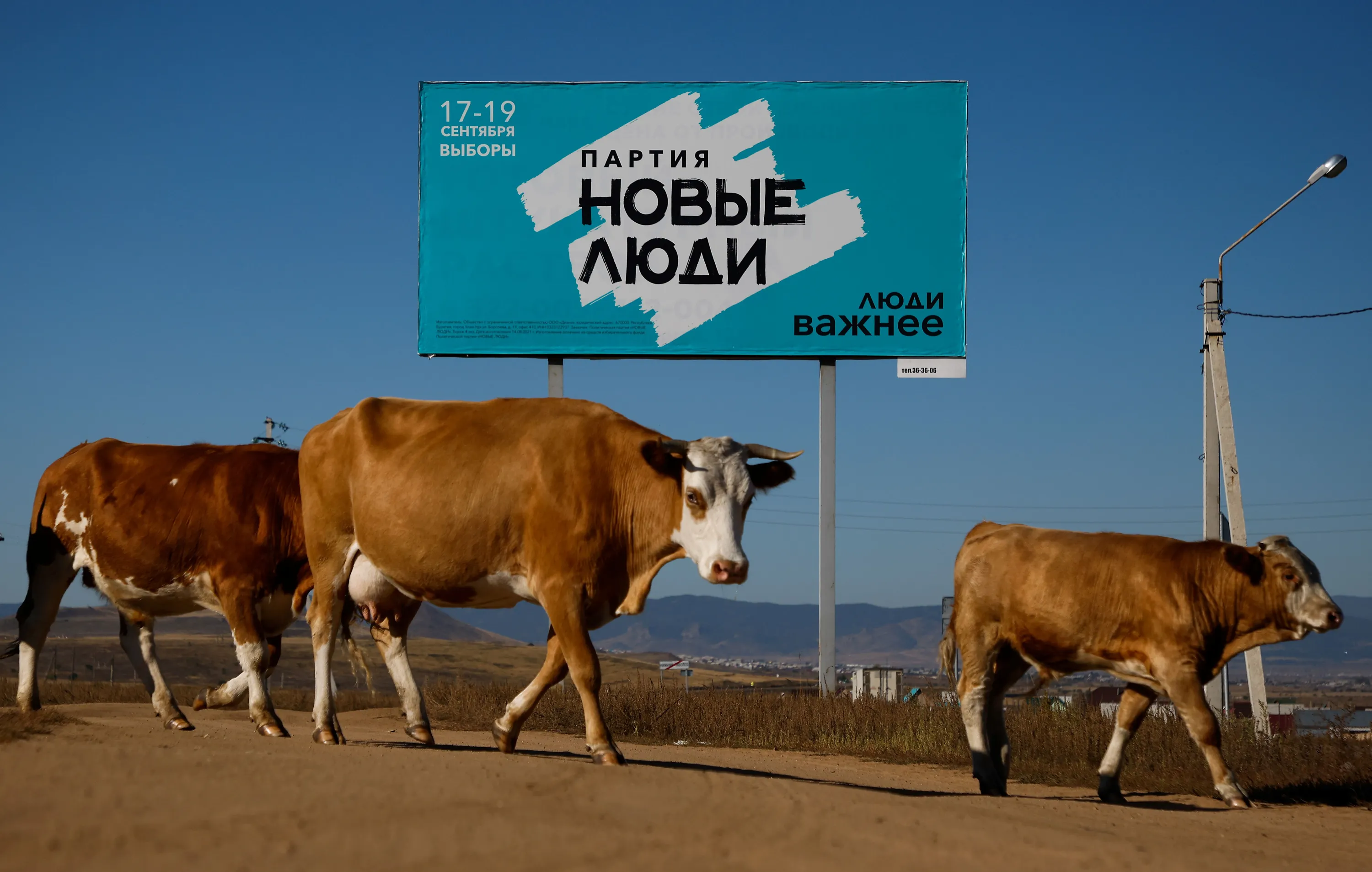Cows walk past a campaign poster of Noviye Lyudi (New People) political party ahead of the Russian parliamentary and regional election outside Ulan-Ude, Buryatia republic, Russia on September 16, 2021. (Photo by Maxim Shemetov/Reuters)