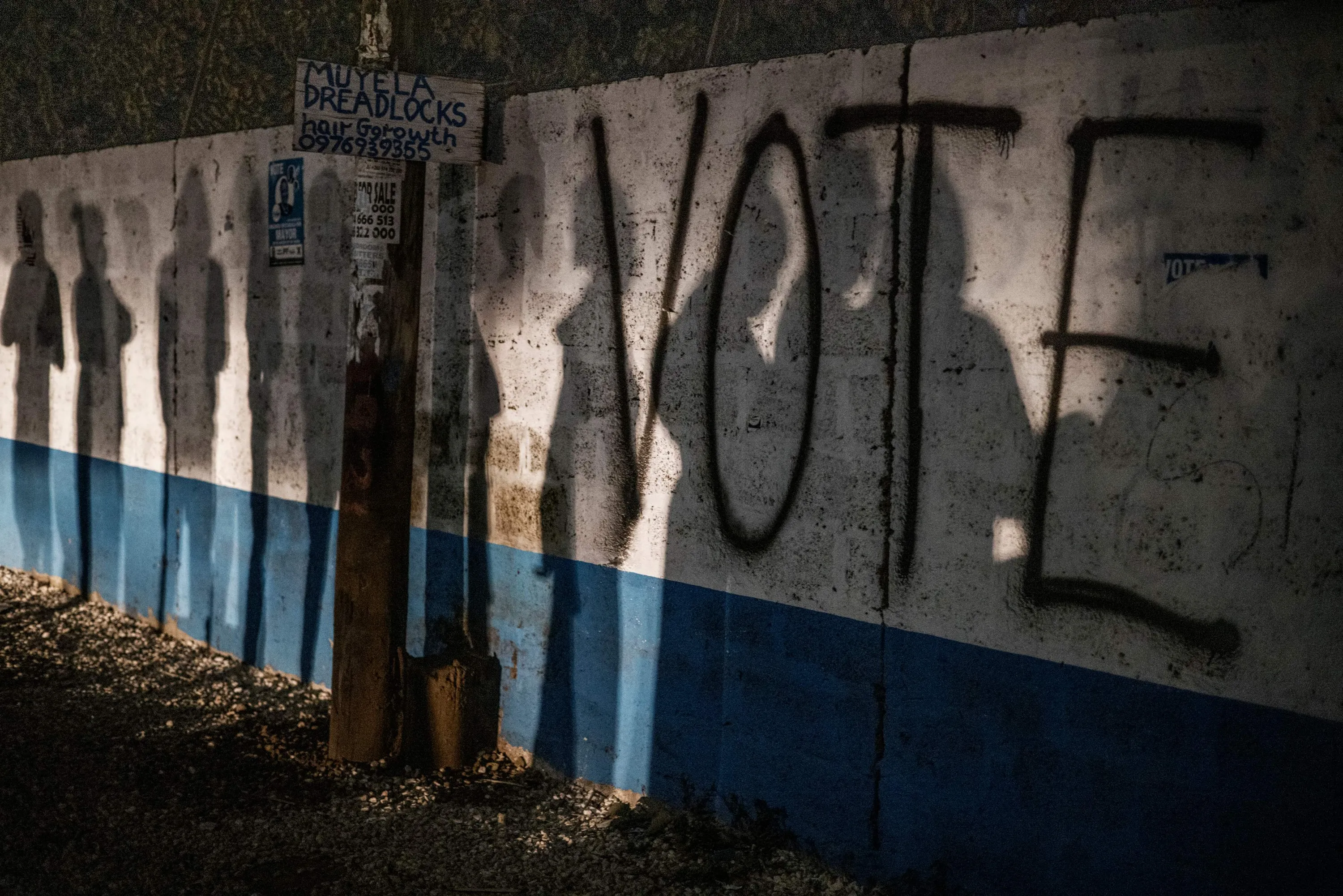 The silhouettes of people queueing for the opening of a polling station appear on a wall where the word “vote” has been spray painted outside the Matero secondary school in Lusaka on August 12, 2021 as Zambian elect their next president after a tense campaign dominated by economic woes in Africa's first coronavirus-era sovereign defaulting country. (Photo by Marco Longari/AFP Photo)
