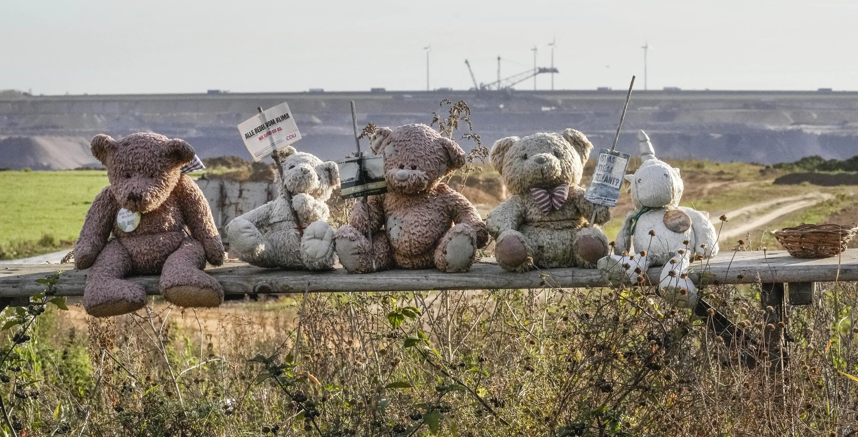 Climate activists protest against the Garzweiler open-cast coal mine with Teddy bears in Luetzerath, western Germany, Friday, October 1, 2021. The village of Luetzerath, now almost entirely abandoned as the mine draws ever closer, will be the latest village to disappear as coal mining at the Garzweiler mine expands. The sign left reads: “all talk about the climate – we ruin it, CDU”. CDU is Germany's Christian Democratic Union party. (Photo by Martin Meissner/AP Photo)