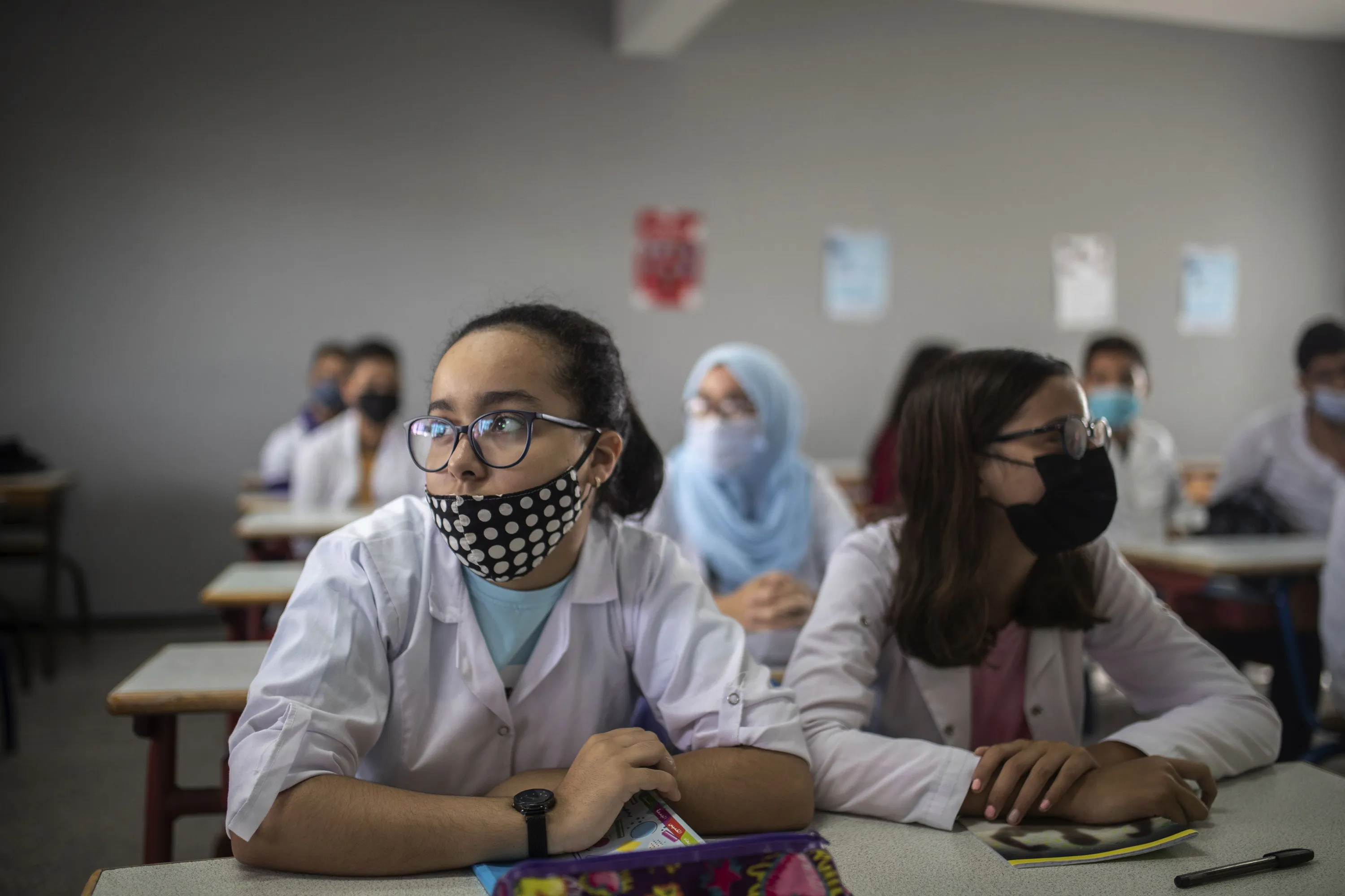 Students wear robes and face masks as they attend first day of new school year in Rabat, Morocco, Friday, October 1 2021. Morocco delayed the return of schools until first of October to vaccinate 12-17 year old children against covid-19. (Photo by Mosa'ab Elshamy/AP Photo)