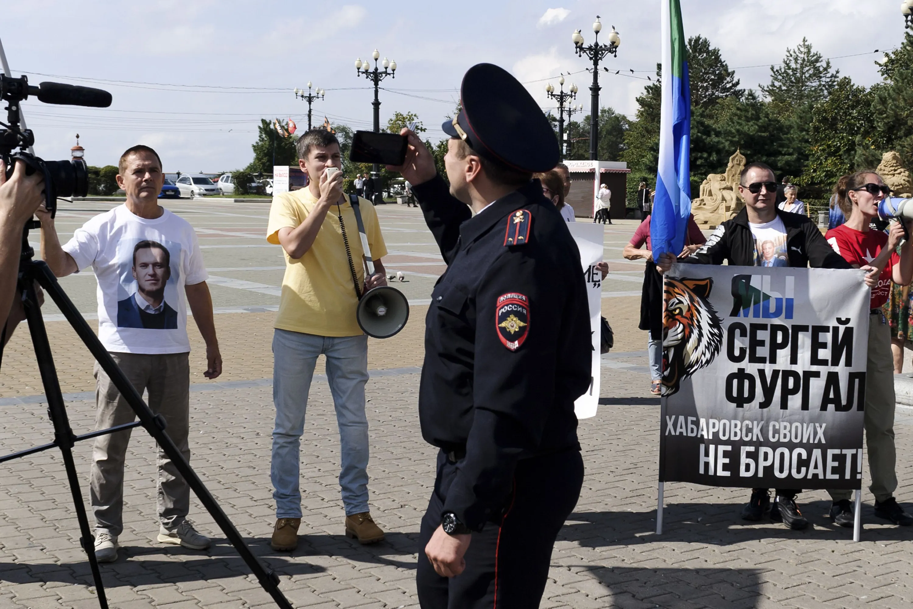 A police officer looks at a group of demonstrators in Khabarovsk, Russia, who had gathered in support of Sergei Furgal, the former governor of the region in the country's Far East, on Saturday, September 11, 2021. A few demonstrators gather in a persistent reminder of the larger protests last year demanding the release of the region's former governor, Sergei Furgal. (Photo by Sergei Demidov/AP Photo)