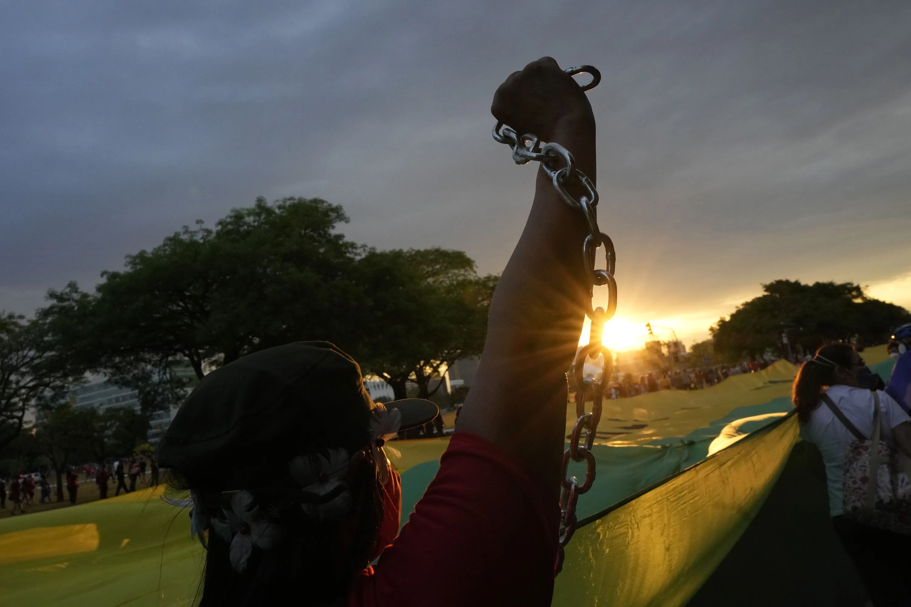 A demonstrator raises a chain during a protest against President Jair Bolsonaro calling for his impeachment over his government's handling of the pandemic and accusations of corruption in the purchases of COVID-19 vaccines, in in Brasilia, Brazil, Saturday, October 2, 2021. (Photo by Eraldo Peres/AP Photo)