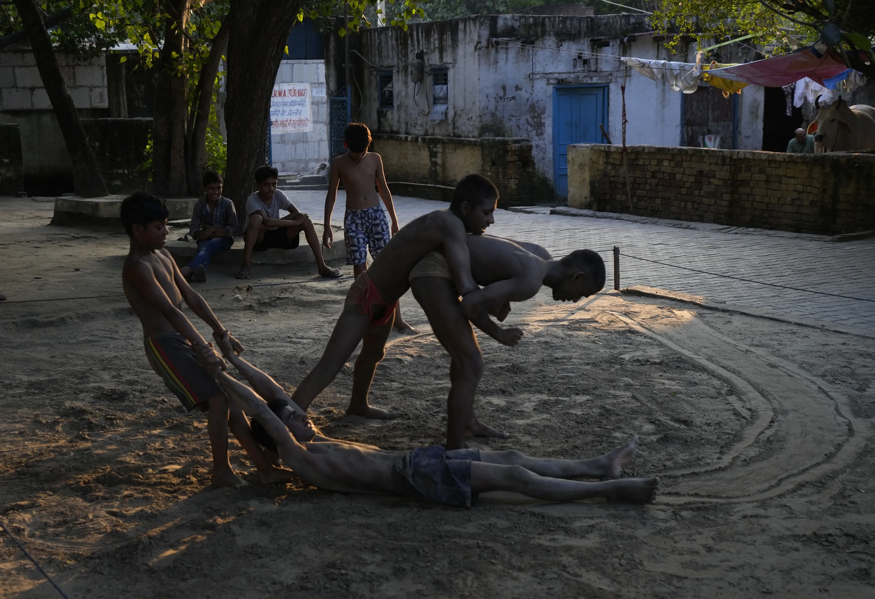 Children play and wrestle on a ghat of the river Yamuna in New Delhi, India, Wednesday, September 29, 2021. (Photo by Manish Swarup/AP Photo)