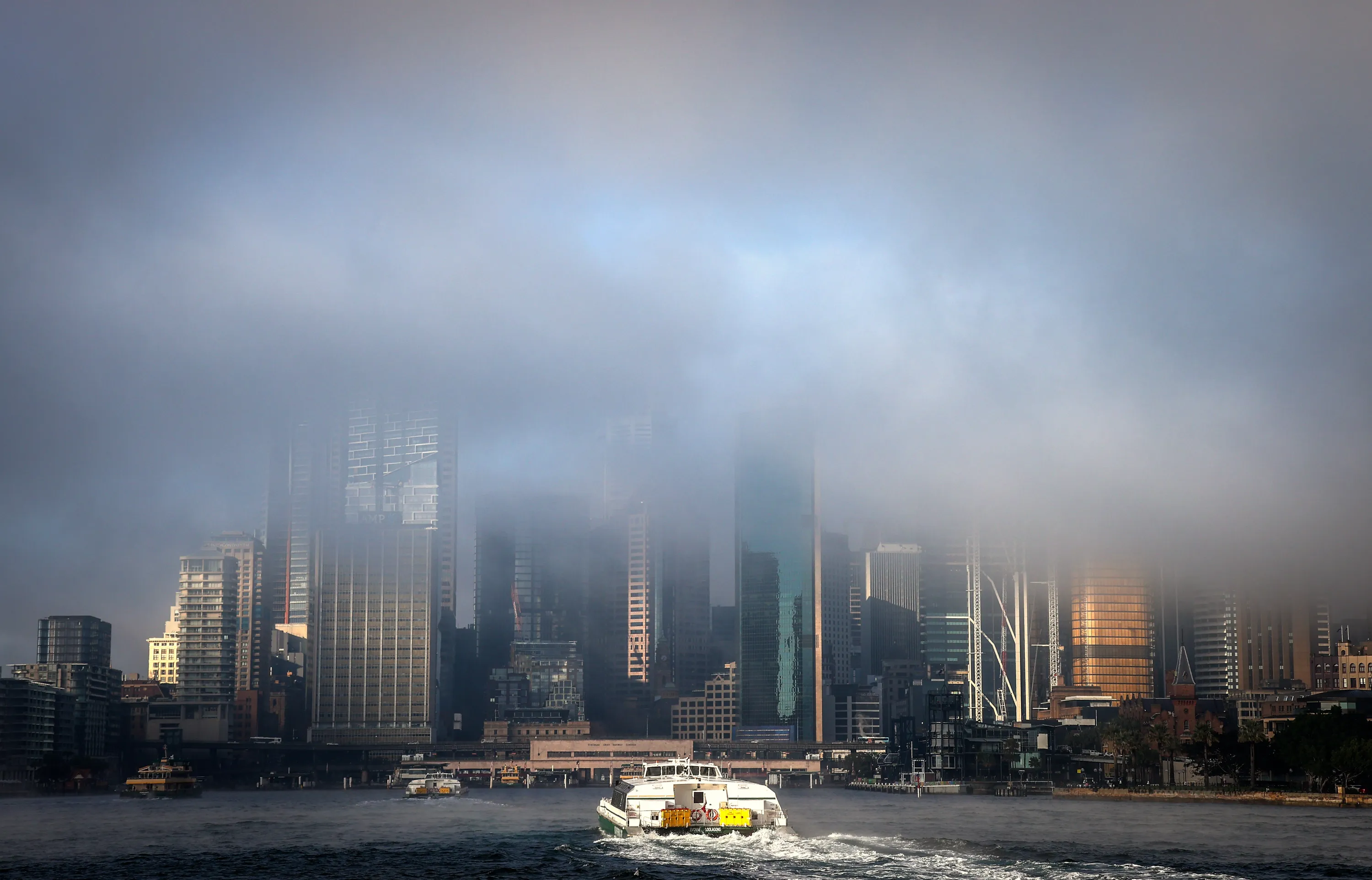 Fog covers buildings in the city as a ferry heads towards Circular Quay on June 11, 2021 in Sydney, Australia. Fog caused delays to ferry services and for drivers into the city due to reduced visibility. (Photo by David Gray/Getty Images)