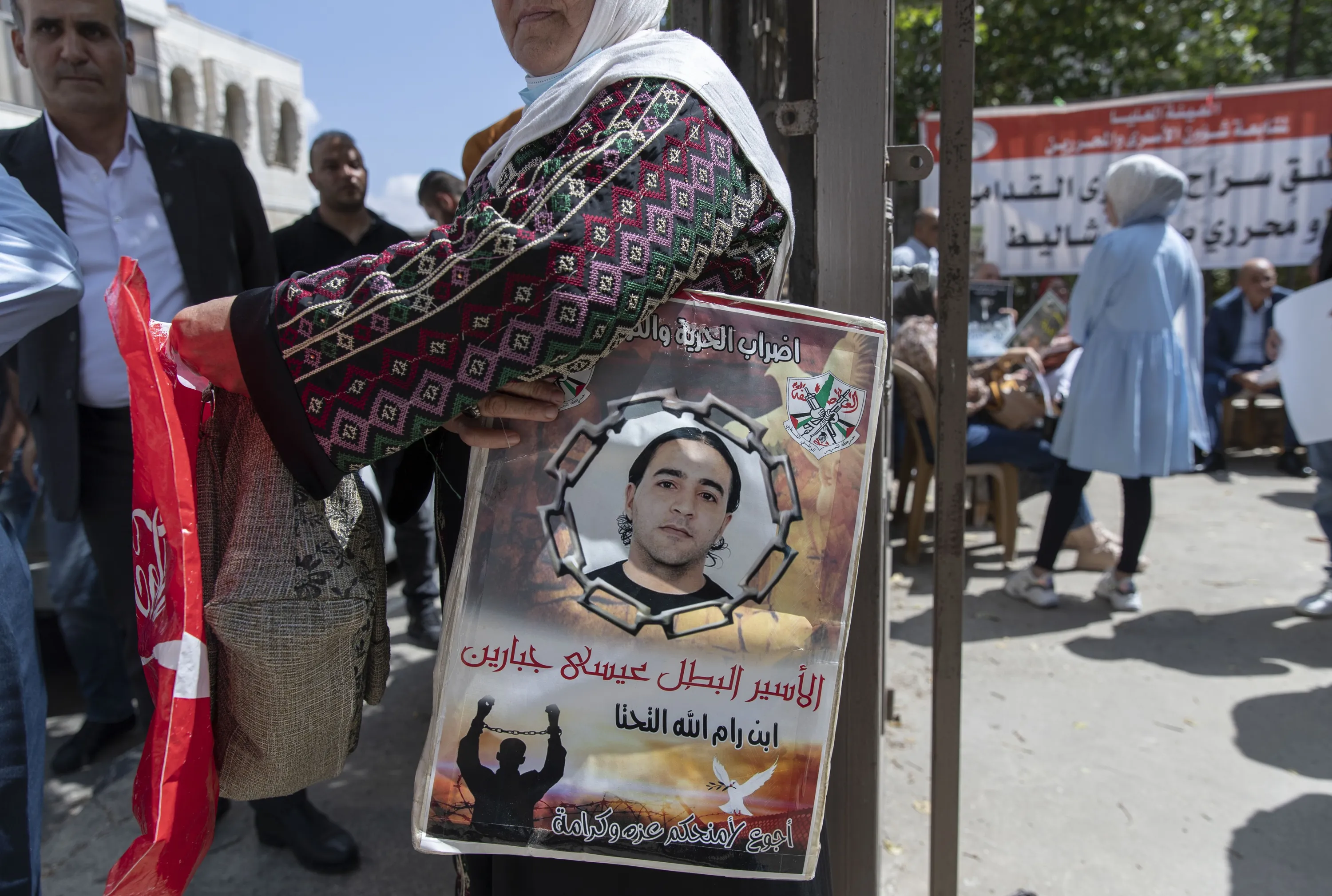 A woman holds a poster with a picture of a Palestinian prisoner that reads “the prisoner hero Issa Jabbareen, I starve for your dignity and pride” during a protest supporting prisoners, in the West Bank city of Ramallah, Tuesday, September 14, 2021. Hundreds of thousands of Palestinians have passed through a military justice system designed for a temporary occupation that is now well into its sixth decade. Nearly every Palestinian has a loved one who has been locked up in that system at some point, and imprisonment is widely seen as one of the most painful aspects of life under Israeli rule. (Photo by Nasser Nasser/AP Photo)