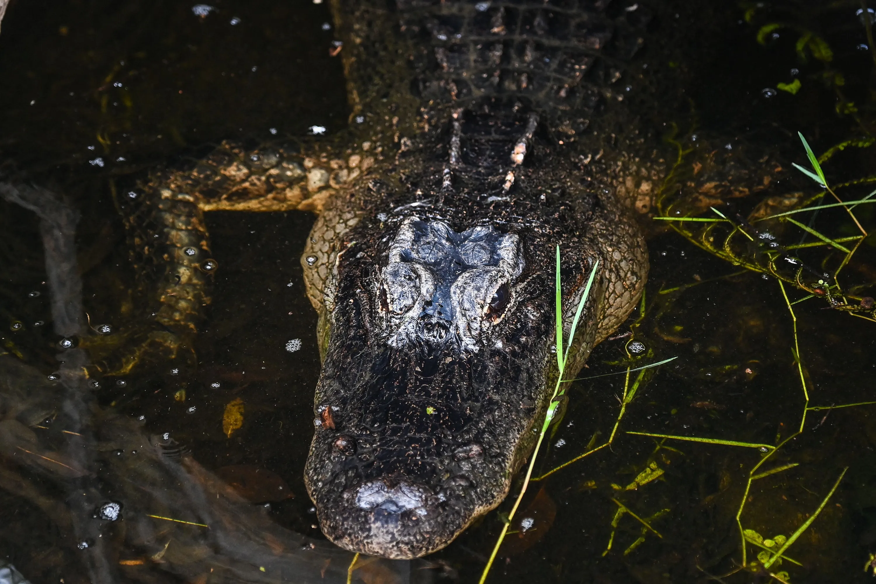 A alligator is seen hiding under a wood log in Everglades wetlands in Everglades National Park, Florida on September 30, 2021. The largest wetland in the United States is the battleground for one of the largest ecological conservation efforts in the world But time is running short, and global warming is threatening a subtropical wilderness that is home to more than 2,000 species of animals and plants. (Photo by Chandan Khanna/AFP Photo)