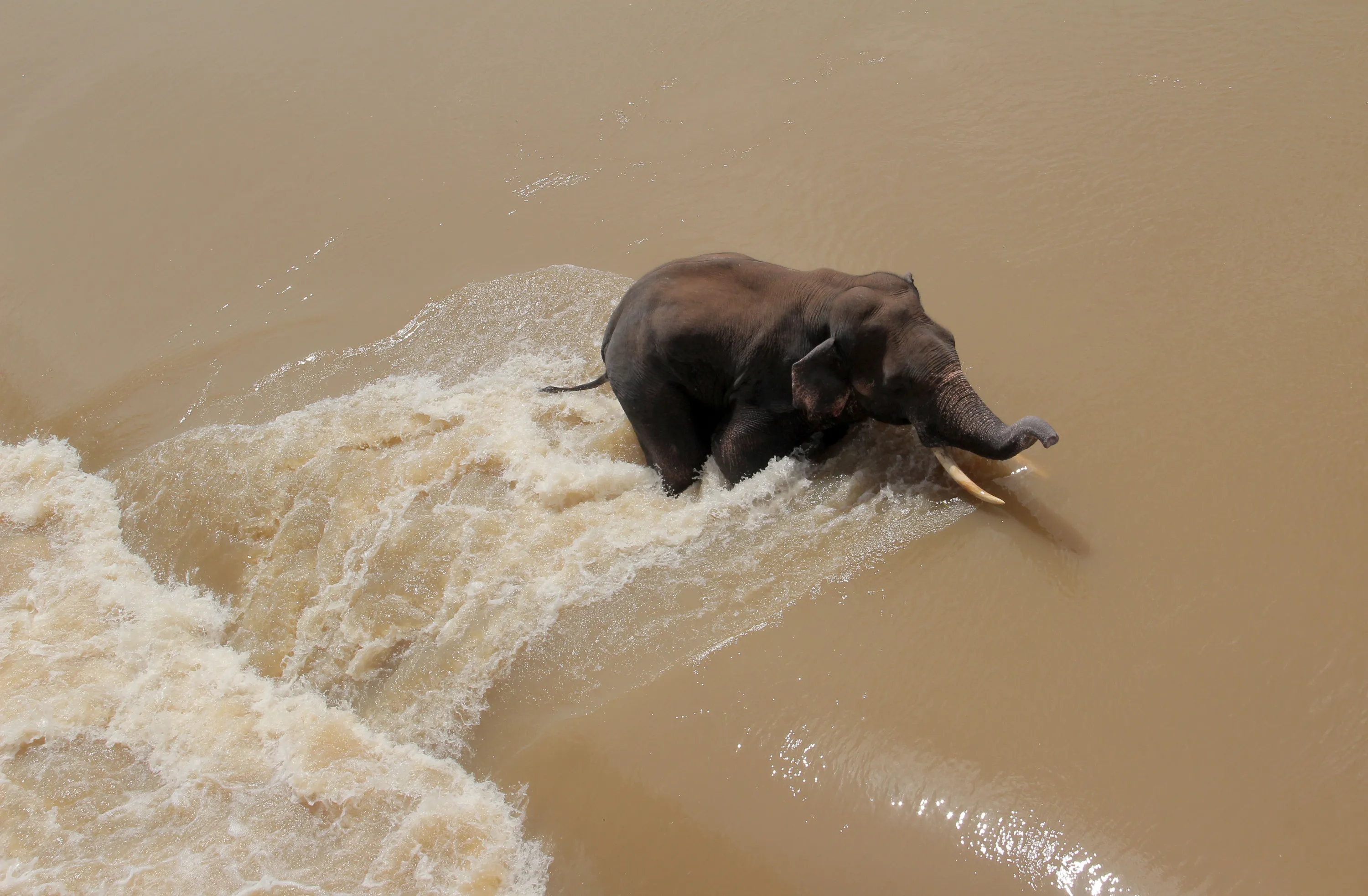 A wild elephant is seen in the flood water as it trapped at the Mundali barrage in Mahanadi river when a herd crossing the flooded river just outskirts of the eastern Indian state Odisha's capital city Bhubaneswar on September 25, 2021. (Photo by NurPhoto/Rex Features/Shutterstock)