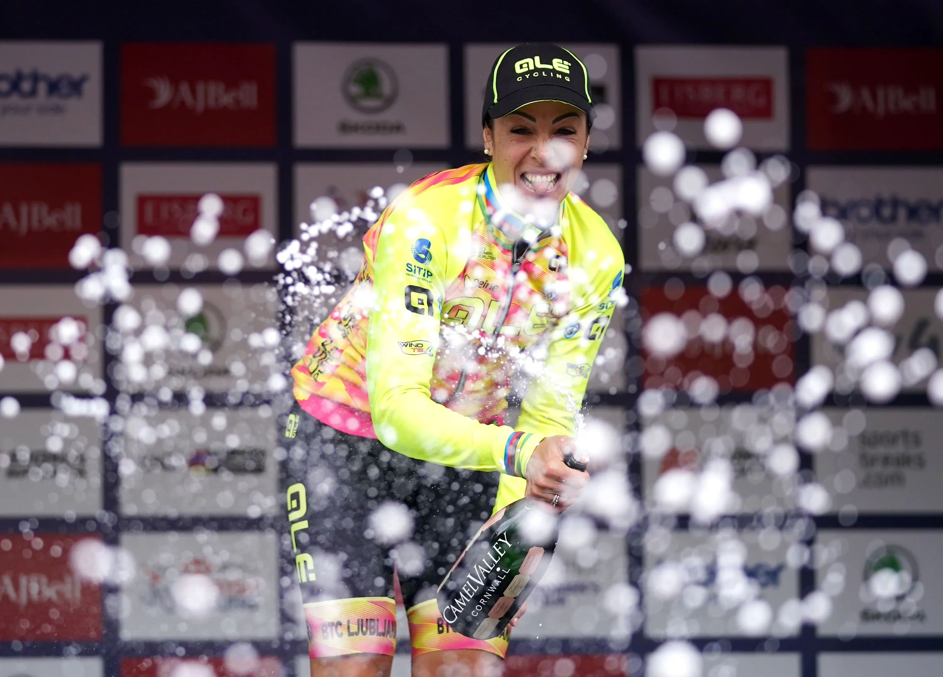 Marta Bastianelli of team Cipollini celebrates winning the first stage of the AJ Bell Women's Tour from Bicester to Banbury, United Kingdom on Monday, October 4, 2021. (Photo by David Davies/PA Images via Getty Images)