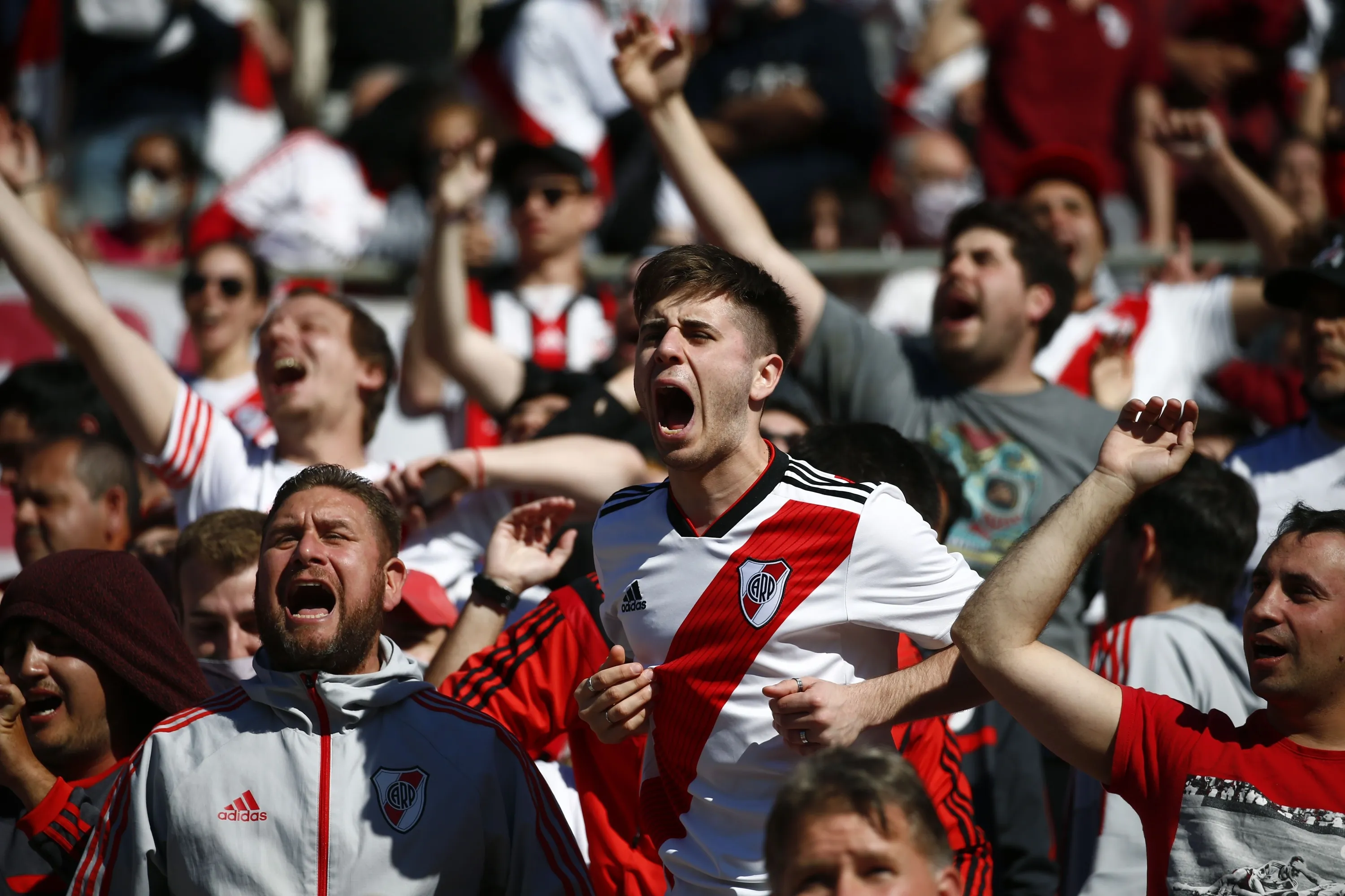 River Plate fans cheer before the start a local tournament soccer match between River Plate and Boca Juniors at Antonio Liberti Vespucio stadium in Buenos Aires, Argentina, Sunday, October 3, 2021. (Photo by Marcos Brindicci/AP Photo)
