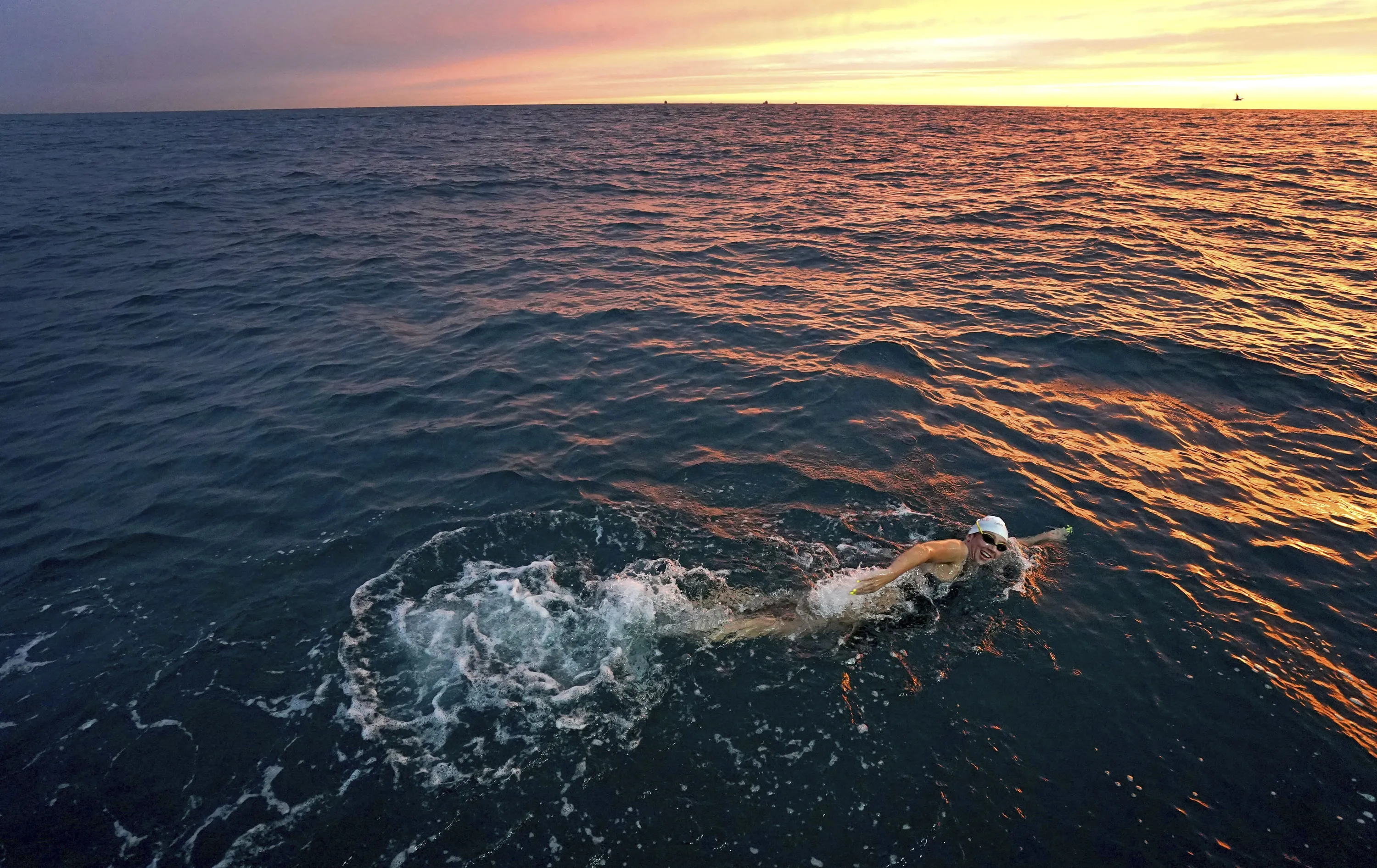 Australian endurance swimmer Chloe McCardel approaches France at sunrise on Thursday, October 7, 2021 during her attempt to swim across the English Channel to equal the World Record, currently held at 43 crossings, before attempting her record breaking 44th crossing due on Sunday. (Photo by Gareth Fuller/PA Images via Getty Images)