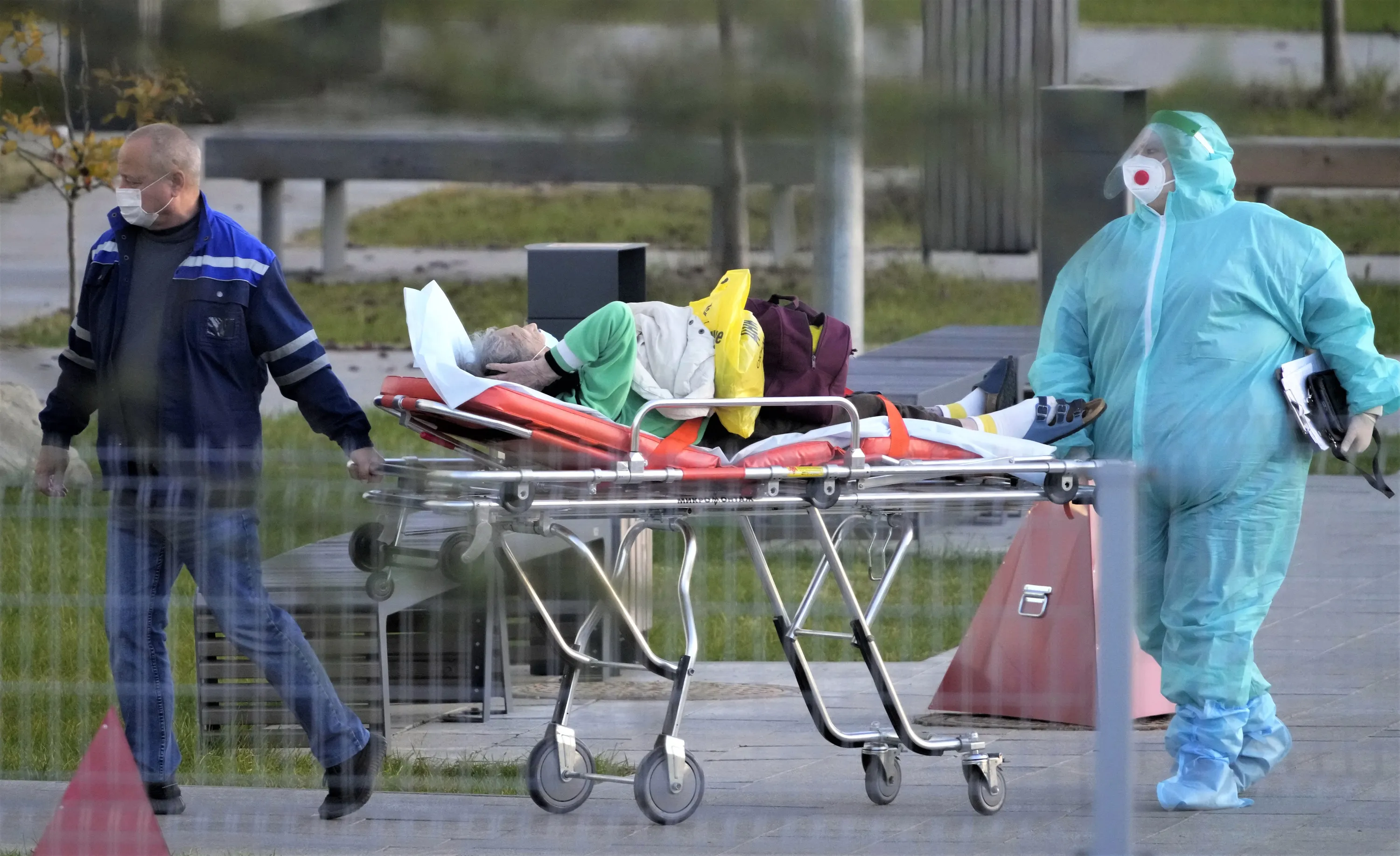 Medical workers carry a patient suspected of having coronavirus on a stretcher at a hospital in Kommunarka, outside Moscow, Russia, Monday, October 11, 2021. Russia's daily coronavirus infections and deaths are hovering near all-time highs amid a laggard vaccination rate and the Kremlin's reluctance to toughen restrictions. Russia's state coronavirus task force reported 29,409 new confirmed cases Monday. That's the highest number since the start of the year and just slightly lower than the pandemic record reached in December. (Photo by Alexander Zemlianichenko/AP Photo)