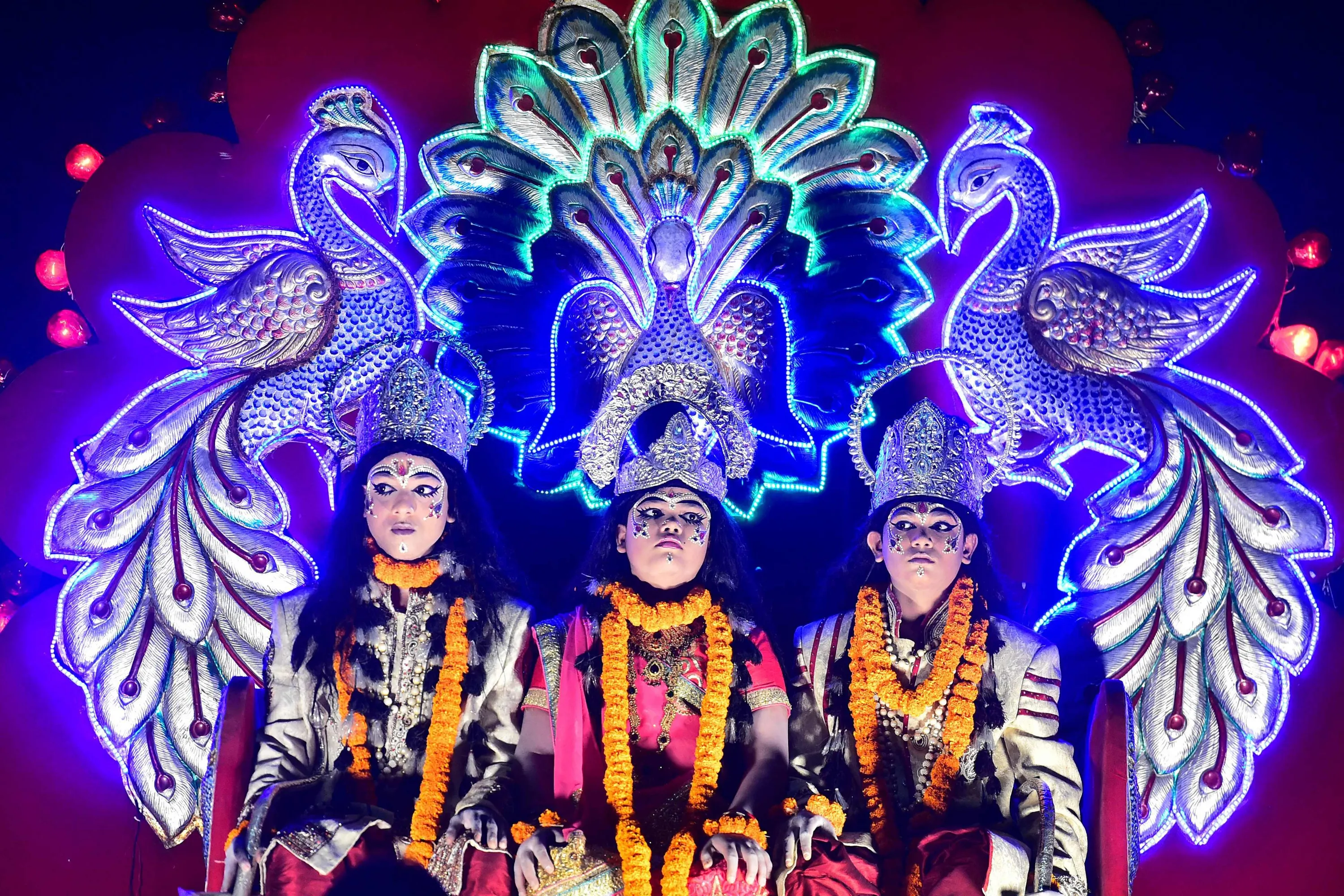 Youths dressed as Hindu deities lord Rama (L), Sita (C) and Laxman sit on a tableau during a festival procession, in Allahabad, India on October 11, 2021. (Photo by Sanjay Kanojia/AFP Photo)