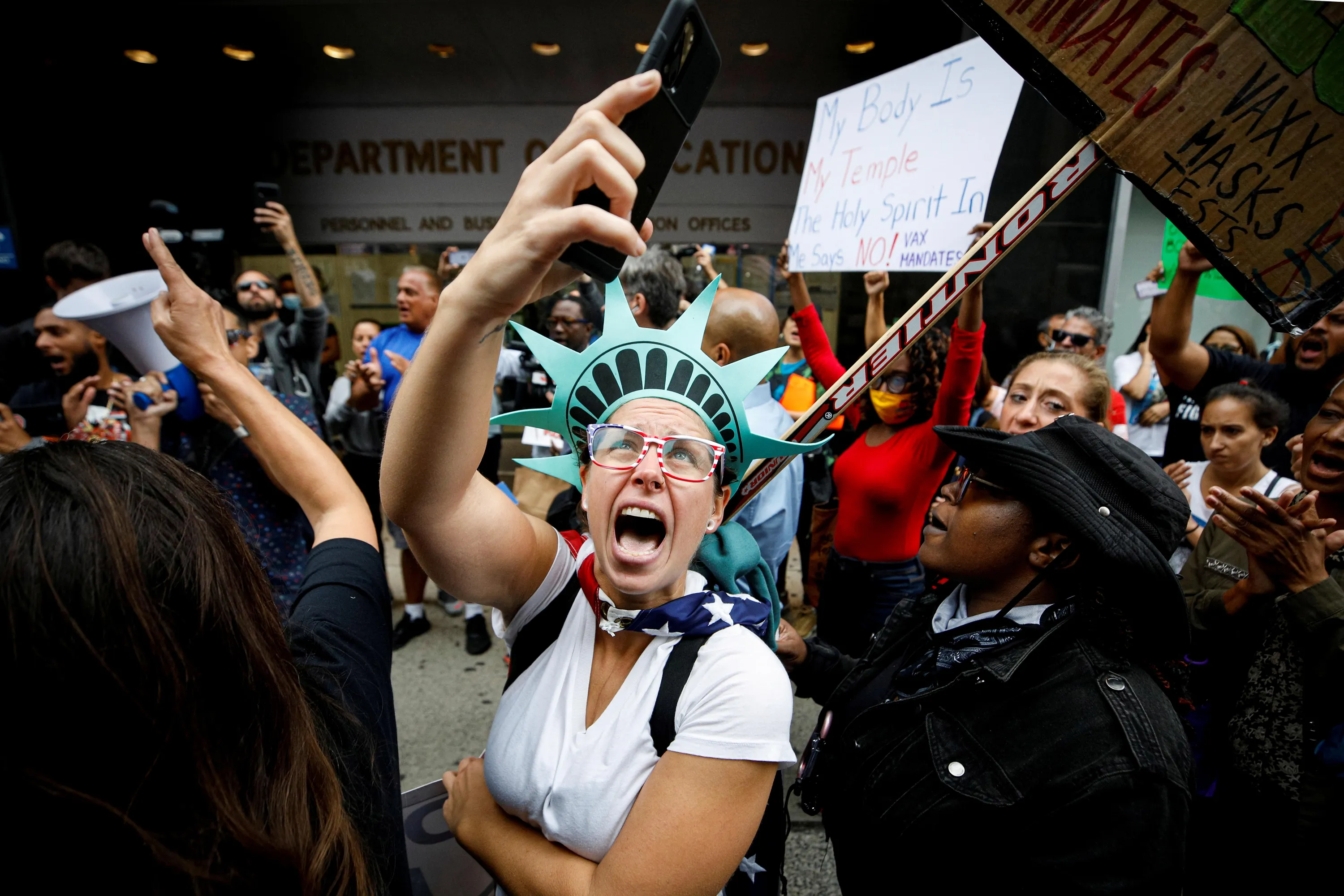 A protester, who identified herself as a New York City school teacher, demonstrates against the mandate that teachers and staff in the New York City Schools system be vaccinated against the coronavirus disease (COVID-19), outside the Department of Education headquarters in the Brooklyn borough of New York City, New York, U.S., October 4, 2021. (Photo by Brendan McDermid/Reuters)