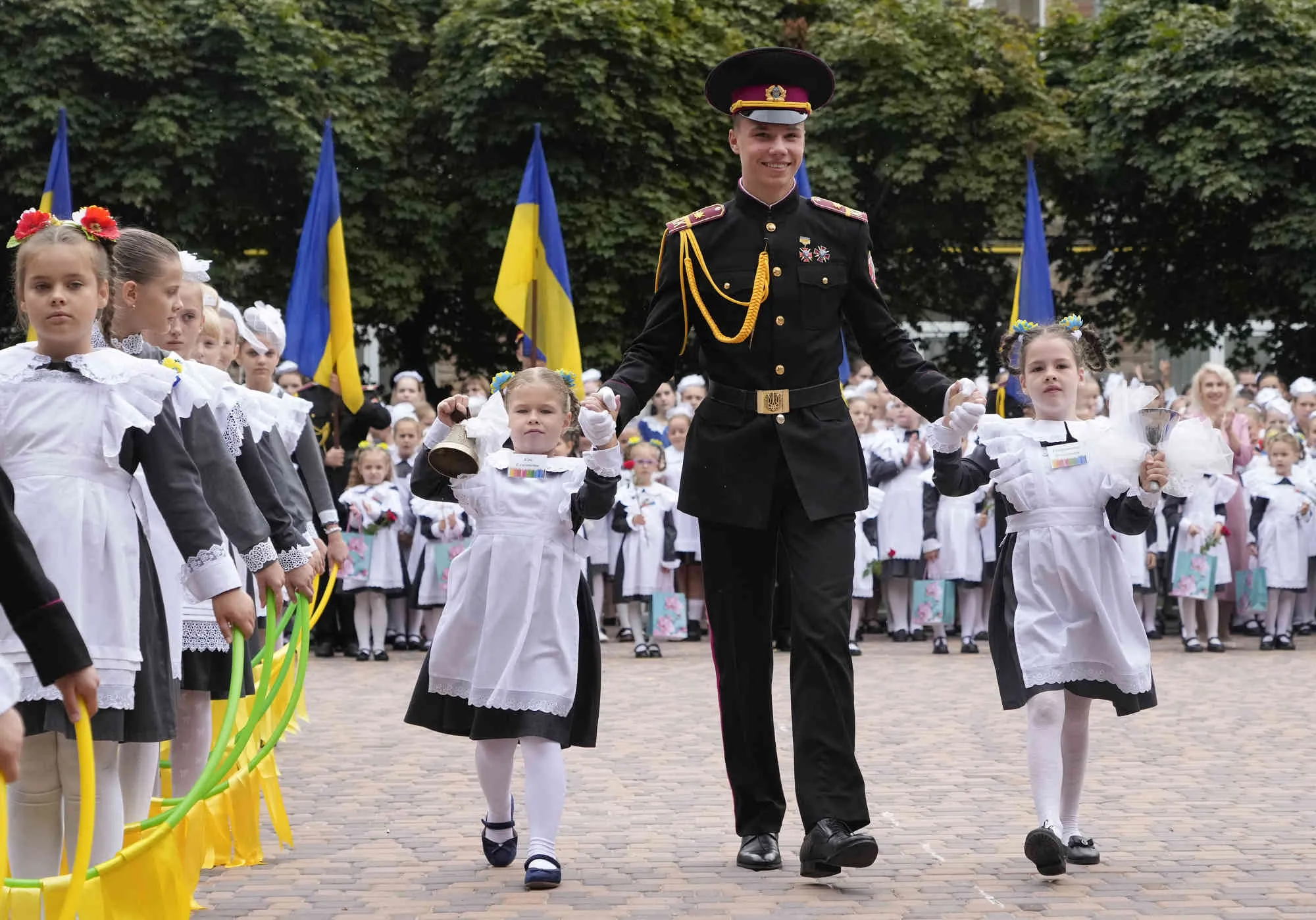 A cadet and schoolgirls run as they ring a symbolic bell, during a ceremony on the occasion of the first day in school at a cadet lyceum in Kyiv, Ukraine, Wednesday, September 1, 2021. Ukraine marks Sept. 1 as Knowledge Day, as a traditional launch of the academic year. (Photo by Efrem Lukatsky/AP Photo)