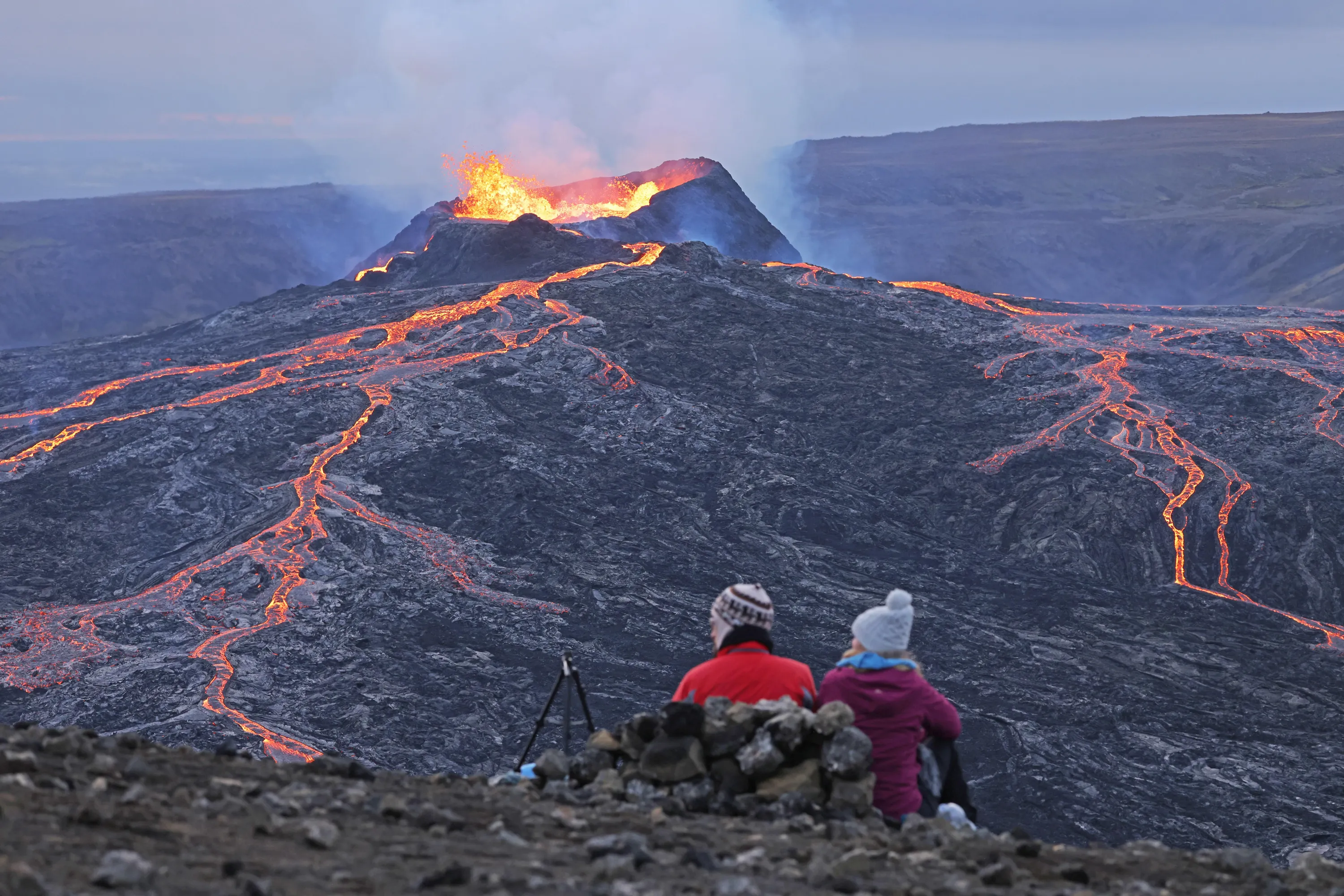 A couple sitting on a hill watch as Fargradalsfjall volcano spews molten lava on August 19, 2021 near Grindavik, Iceland. Iceland is feeling a strong impact from global warming. While the volcano, which erupted in March of this year, lies in the volcanic lowlands southwest of Reykjavik, other Icelandic volcanoes lie under the island's large ice caps, such Eyjafjallajokull, which erupted in 2010. Since the 1990s 90% of Iceland's glaciers have been retreating and projections for the future show a continued and strong retreat in size of its three ice caps. The reduction in mass and pressure from the melting ice caps is increasing the likelihood of further seismic and volcanic activity. (Photo by Sean Gallup/Getty Images)