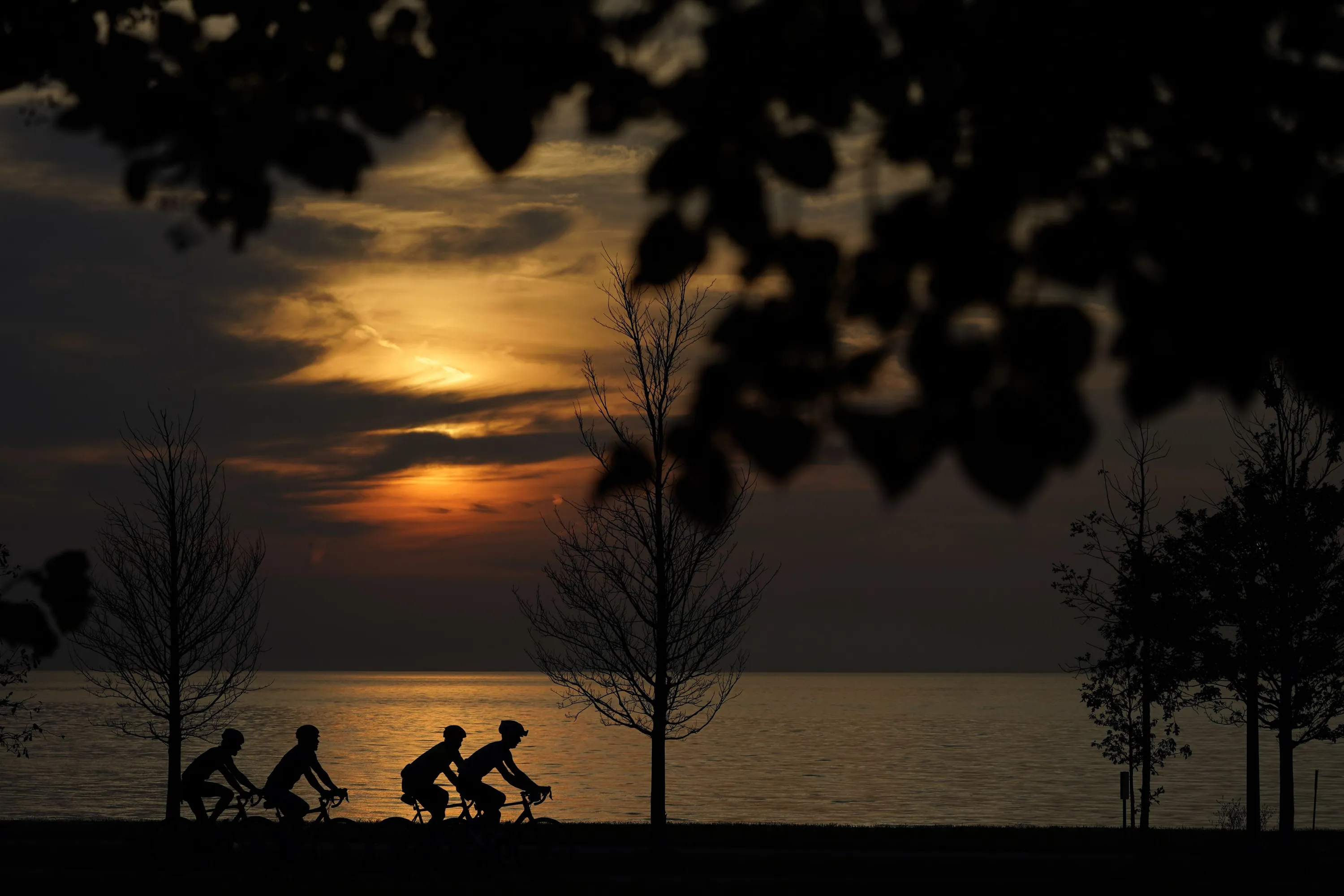 Four cyclists navigate the bike trail along Lake Michigan shortly after sunrise Friday, August 27, 2021, in Chicago. (Photo by Charles Rex Arbogast/AP Photo)