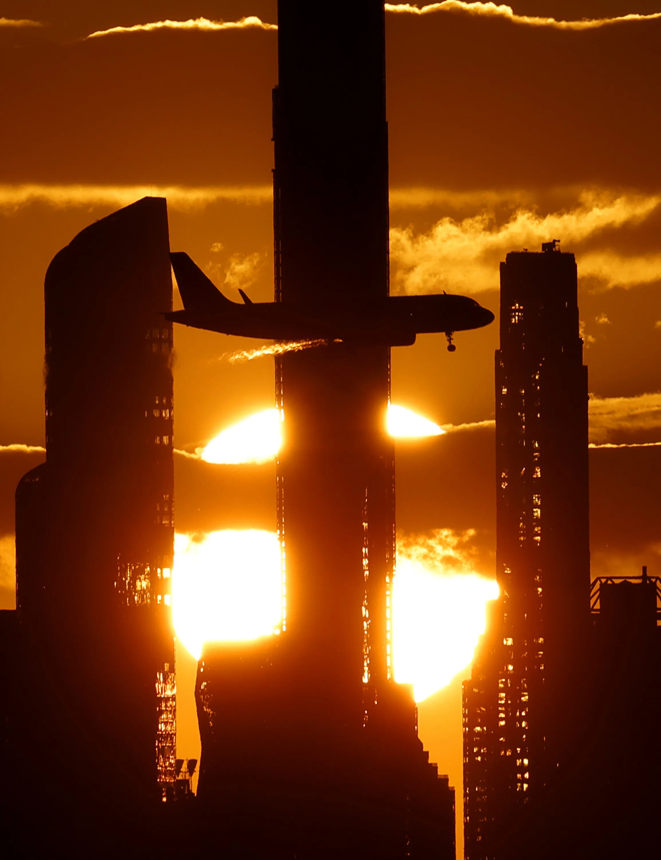 An airplane moves across the Manhattan Skyline at sunset during the second round of the 2021 US Open Tennis Championships at the USTA Billie Jean King National Tennis Center on Thursday, September 2, 2021 in New York City. (Photo by John Angelillo/UPI/Rex Features/Shutterstock)