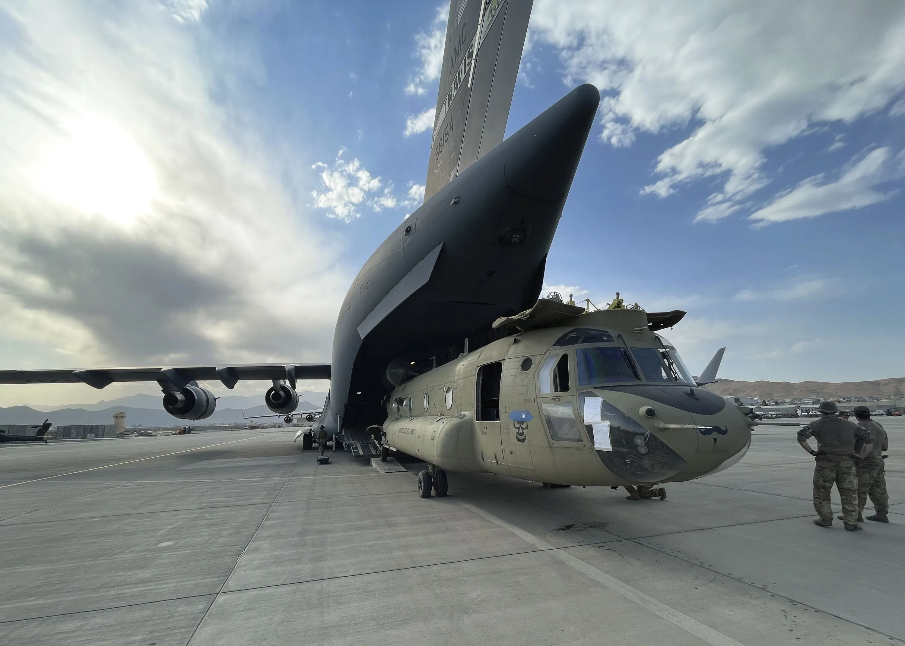 In this image provided by the Department of Defense, a CH-47 Chinook from the 82nd Combat Aviation Brigade, 82nd Airborne Division is loaded onto a U.S. Air Force C-17 Globemaster III at Hamid Karzai International Airport in Kabul, Afghanistan, Saturday, August 28, 2021. (Photo by Department of Defense via AP Photo)
