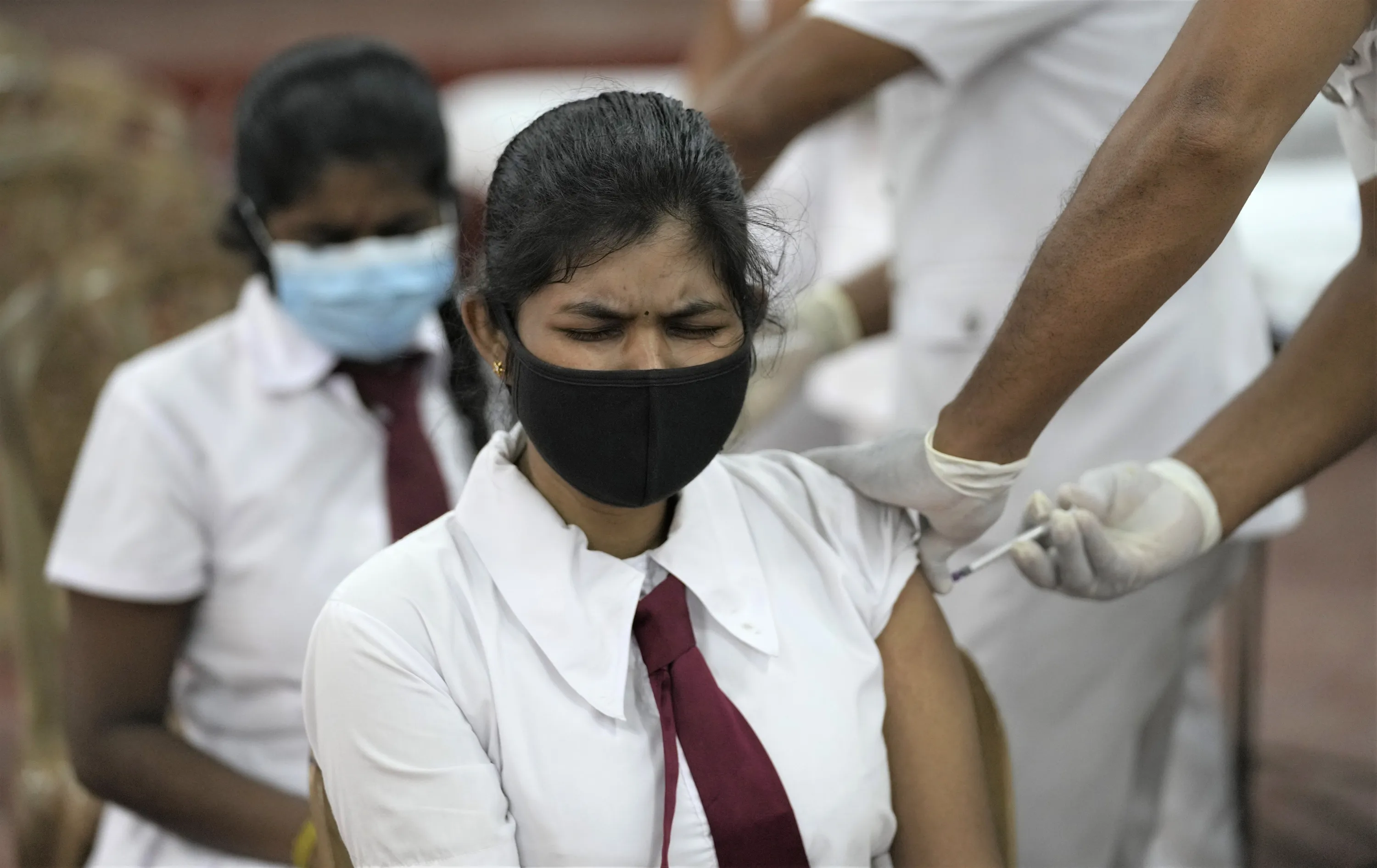 A Sri Lankan school student receives a COVID-19 vaccine in Colombo, Sri Lanka, Friday, October 15, 2021. Sri Lanka is vaccinating 18- and 19-year-olds against the coronavirus as it expands the shots to students. After beginning with older people, Sri Lanka has now vaccinated 57% of its 22 million population. (Photo by Eranga Jayawardena/AP Photo)