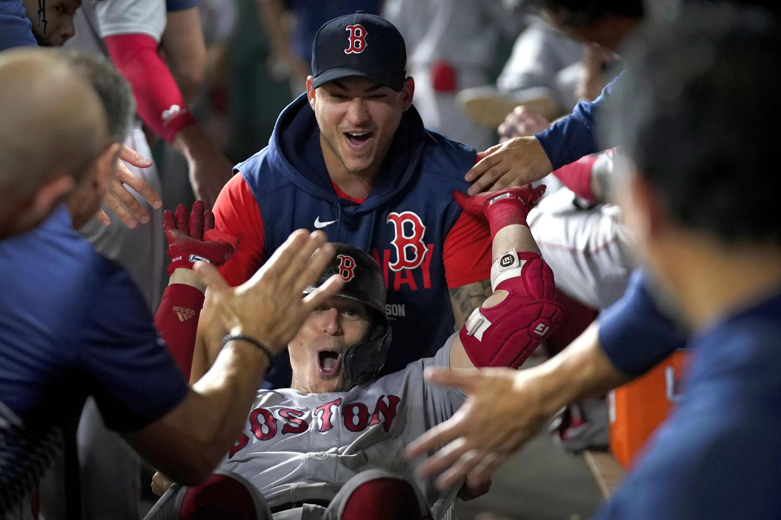 Boston Red Sox's Enrique Hernandez celebrates in the dugout after a home run against the Houston Astros during the third inning in Game 1 of baseball's American League Championship Series Friday, October 15, 2021, in Houston. (Photo by David J. Phillip/AP Photo)