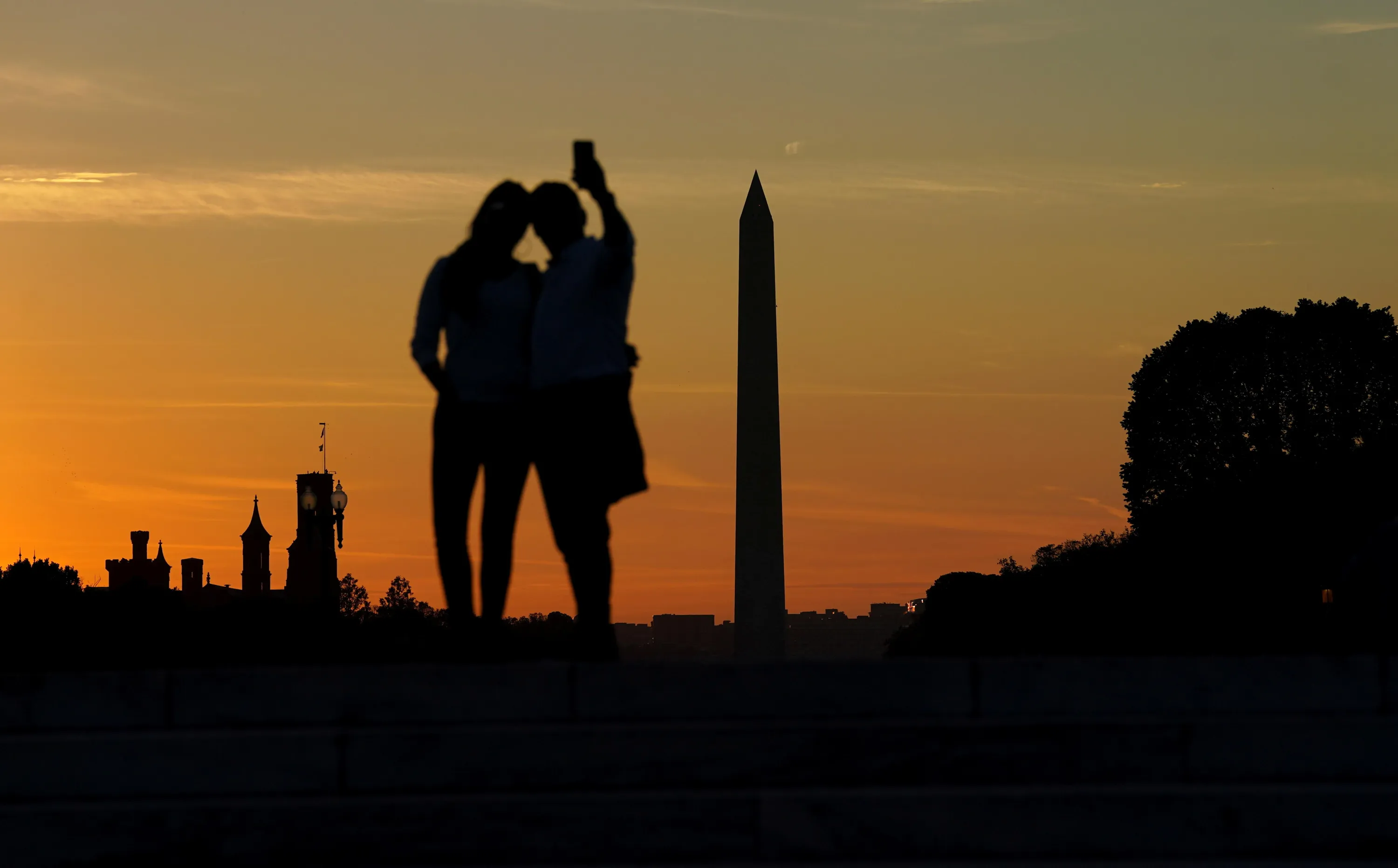 The sky goes orange behind the Washington Monument and the Smithsonian Castle as a couple pose for a sunset selfie in Washington U.S., October 14, 2021. (Photo by Kevin Lamarque/Reuters)