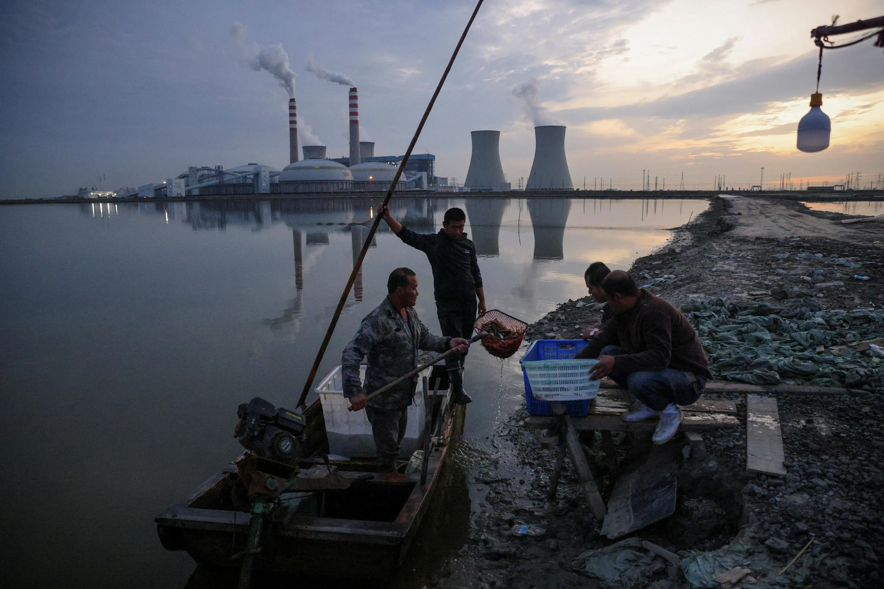 Fishermen bring in their catch from a lake in front of a power plant of the State Development and Investment Corporation (SDIC) outside Tianjin, China, October 14, 2021. (Photo by Thomas Peter/Reuters)