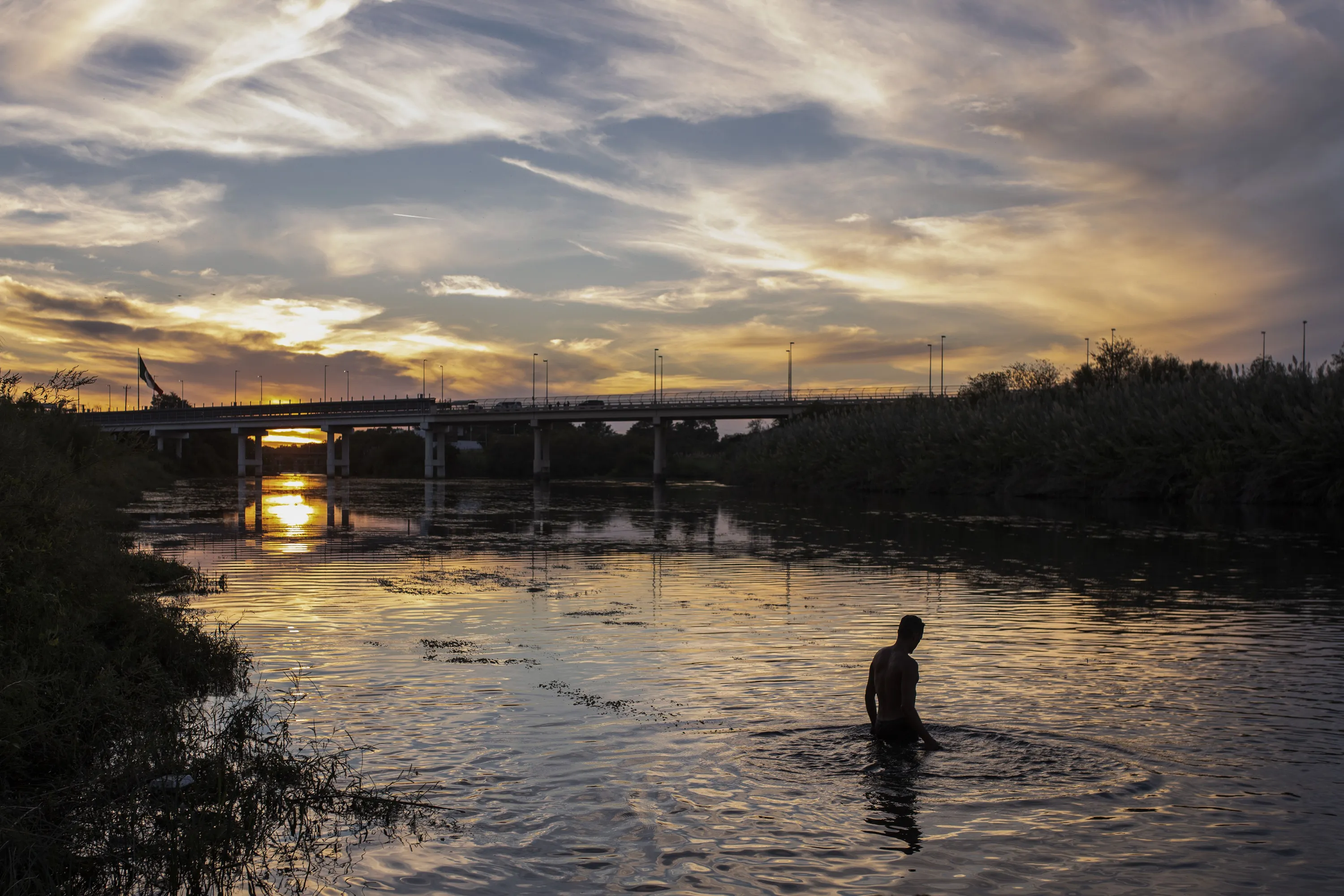 A Haitian migrant bathes in the waters of the Rio Grande in Ciudad Acuna, Mexico, Friday, September 24, 2021, across from Del Rio, Texas. (Photo by Felix Marquez/AP Photo)