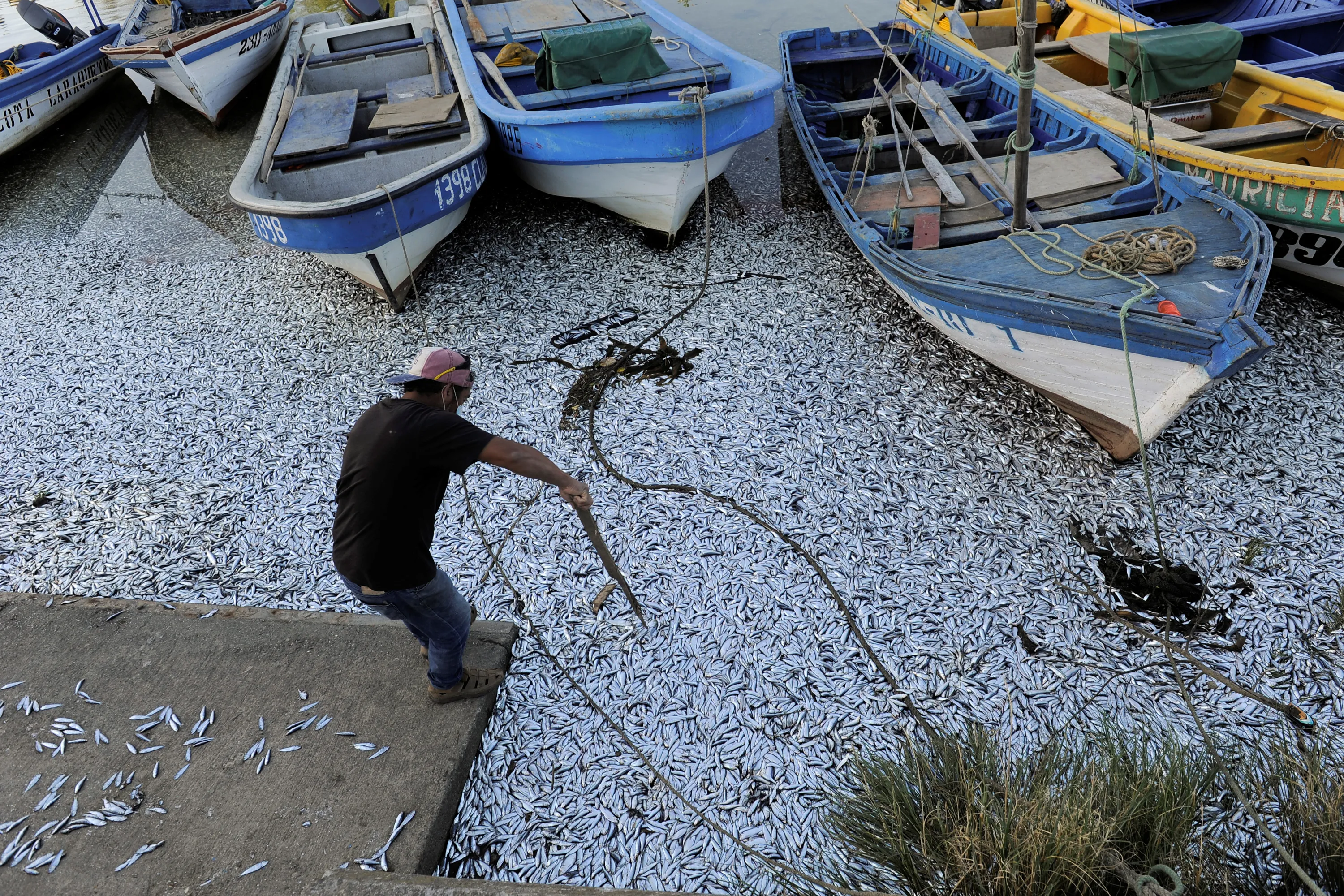 A man uses a wooden stick to move dead sardines washed up on the shores of the Laraquete river, as local authorities say the fish could have died due to a lack of oxygen in the water, in Laraquete, Chile on February 15, 2021. (Photo by Jose Luis Saavedra/Reuters)