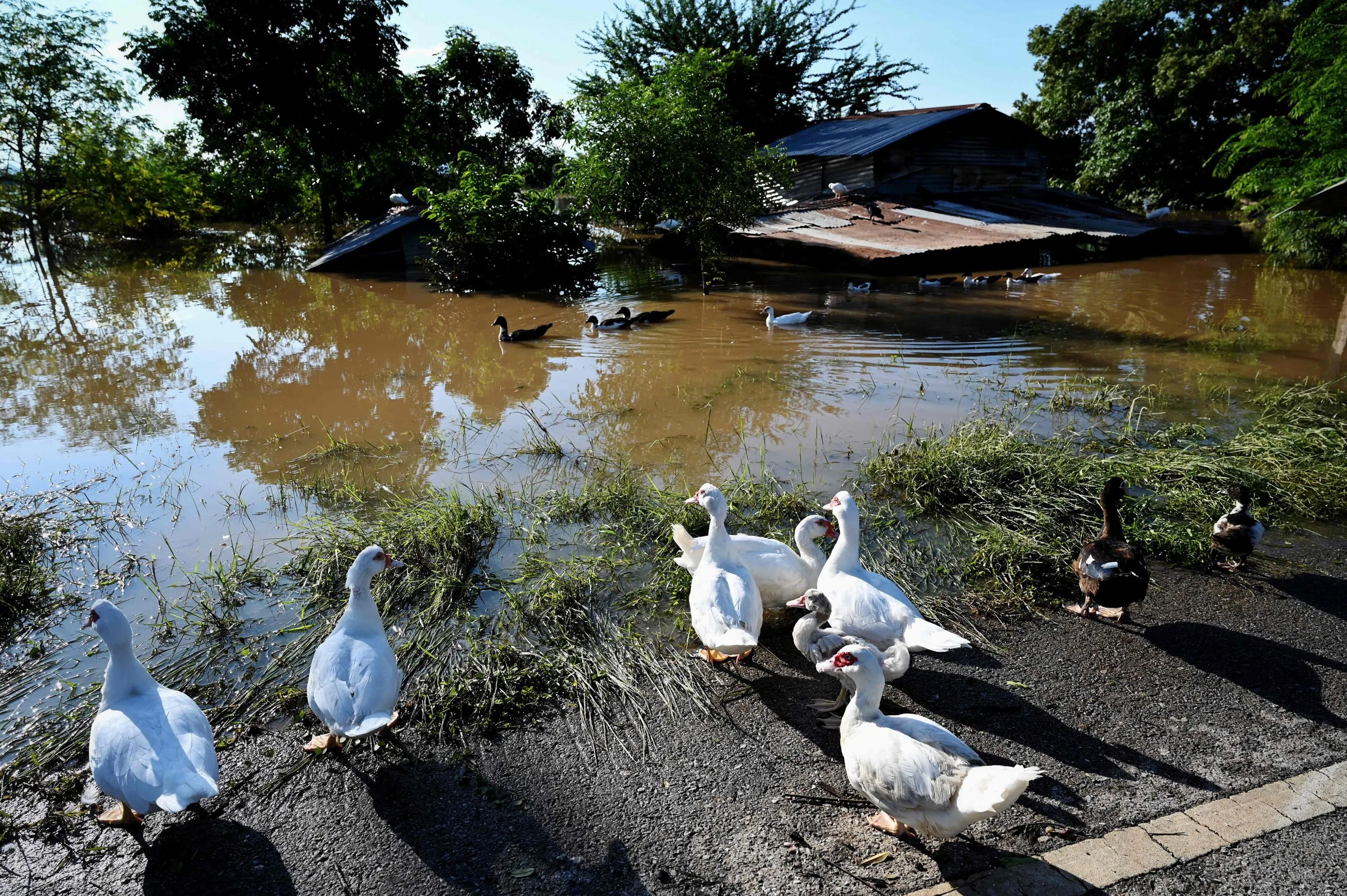 Ducks stand on the road as floodwaters partially submerge their village in the central Thai province of Lopburi on September 28, 2021, as tropical storm Dianmu caused flooding in 30 provinces across the country. (Photo by Lillian Suwanrumpha/AFP Photo)