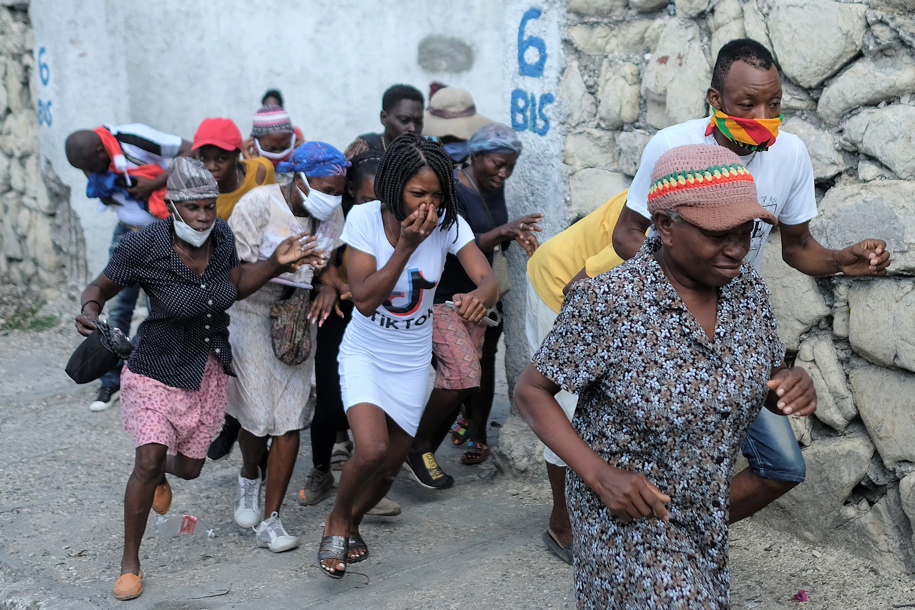 People who were marching to the prime ministers' residence, to demand justice for the assassination of Haitian President Jovenel Moise, run from tear gas fired by police in Port-au-Prince, Haiti, Wednesday, October 20, 2021. (Photo by Matias Delacroix/AP Photo)