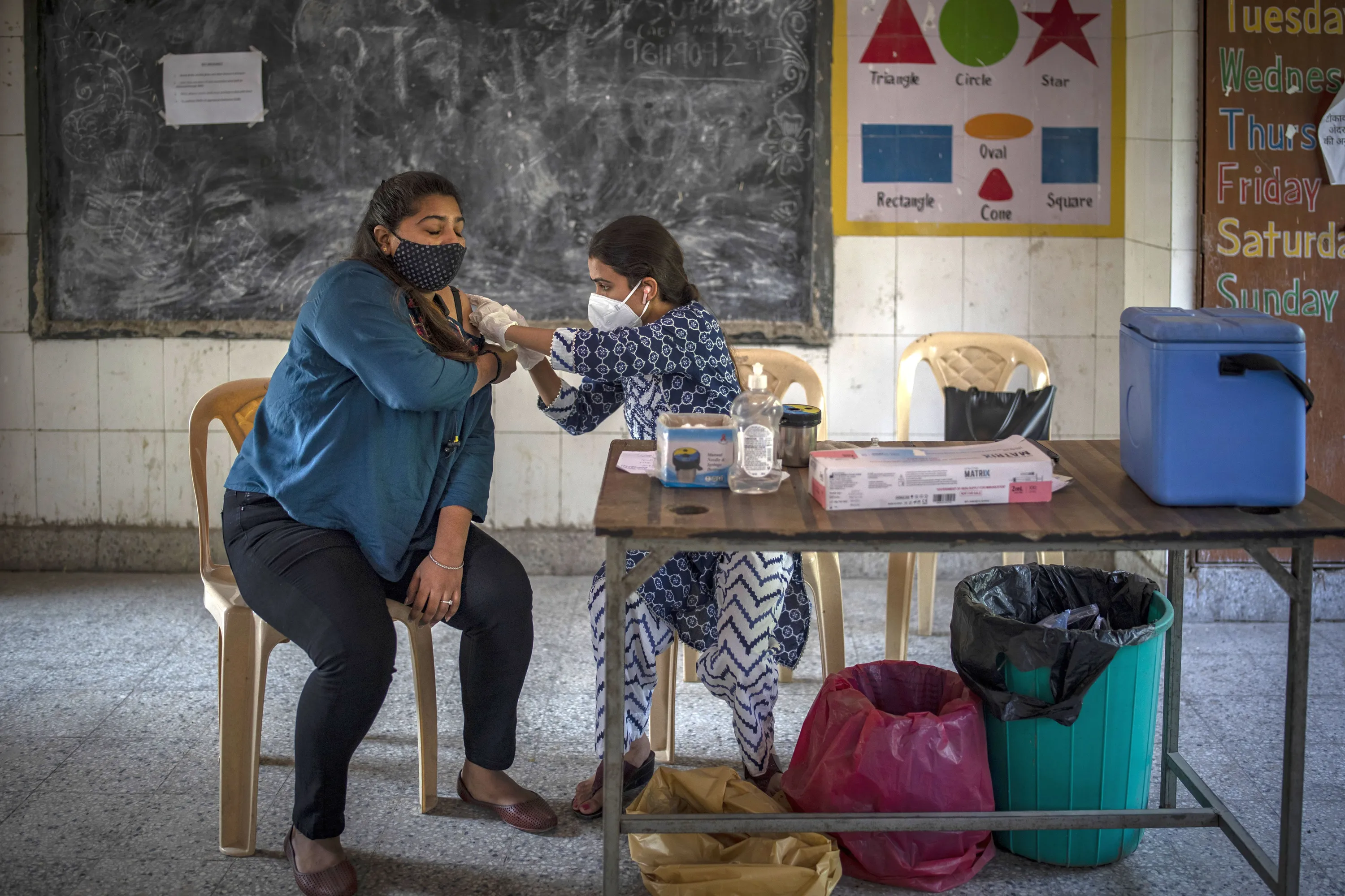 A health worker inoculates a woman during a vaccination drive against coronavirus inside a school in New Delhi, India, Wednesday, October 20, 2021. India is nearing a milestone of administering a total of one billion doses against COVID-19. (Photo by Altaf Qadri/AP Photo)