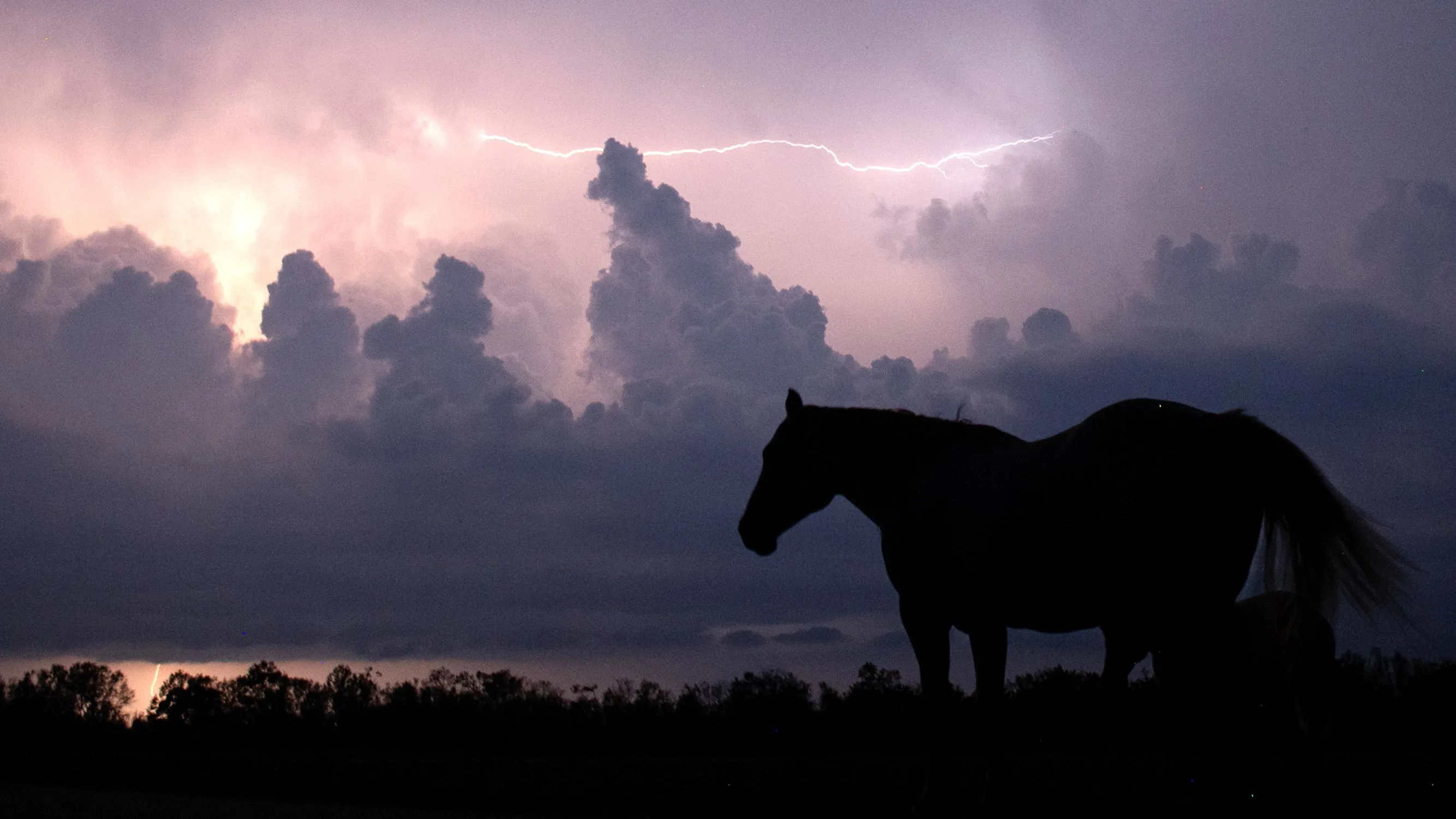 An unattended horse is seen in a lightning storm on September 02, 2021 in Belle Chasse, Louisiana. Many animals throughout Louisiana have been displaced as Hurricane Ida has torn through the Southwest causing massive damage and flooding along the Gulf Coast. Various stores remain closed and services suspended as power throughout New Orleans and its surrounding region is down. Ida made landfall as a Category 4 hurricane on August 29 in Louisiana bringing flooding and immense wind damage. (Photo by Brandon Bell/Getty Images)