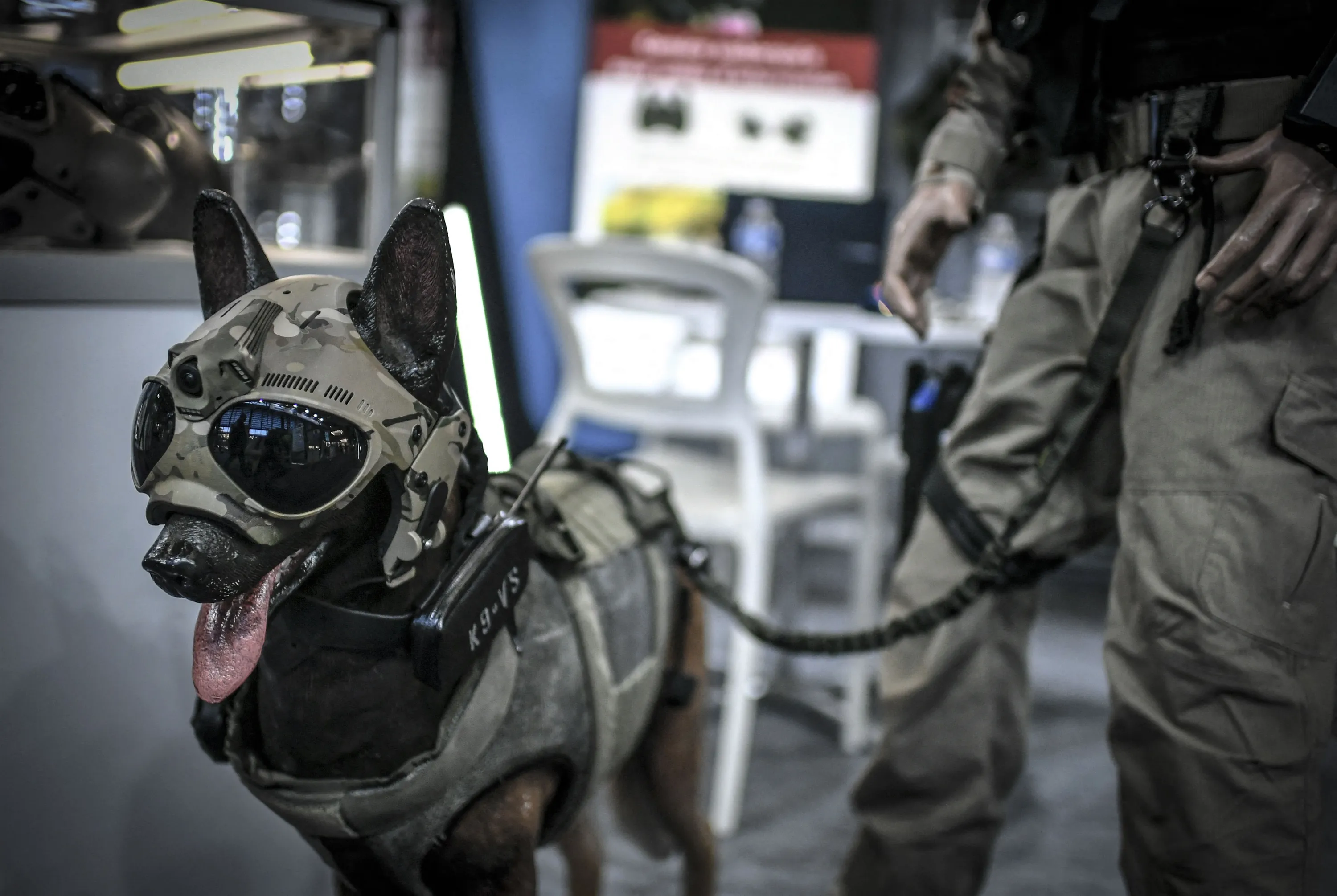 This photograph taken on October 19, 2021 shows a dummy dog wearing a mask equipped with cameras and a transmission device displayed at the 22nd worldwide exhibition of internal State security (MILIPOL) in Villepinte, north of Paris. (Photo by Stephane de Sakutin/AFP Photo)