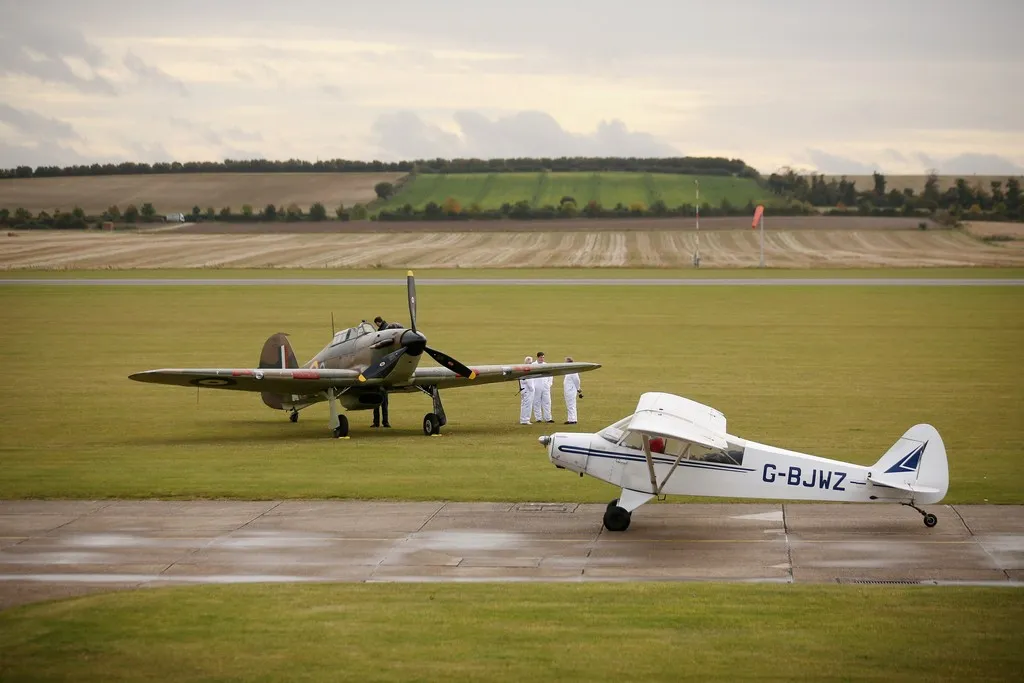 DUXFORD, ENGLAND - OCTOBER 18: A Hawker Hurricane Mk XIIa 5711 (G-HURI) fighter aircraft (L) prepares to perform an aerobatic display at the IWM Duxford on October 18, 2012 in Duxford, England. The aeroplane, similar to those that defended British shores during the Battle of Britain in World War II, is due to be auctioned by Bonhams in their sale of 'Collectors? Motor Cars and Automobilia' at Mercedes-Benz World Brooklands on December 3, 2012. The plane was built in 1942 and joined the Royal Canadian Air Force the following year, where it remained for the duration of the war, it is expected to fetch up to 17. million GBP. (Photo by Oli Scarff/Getty Images)