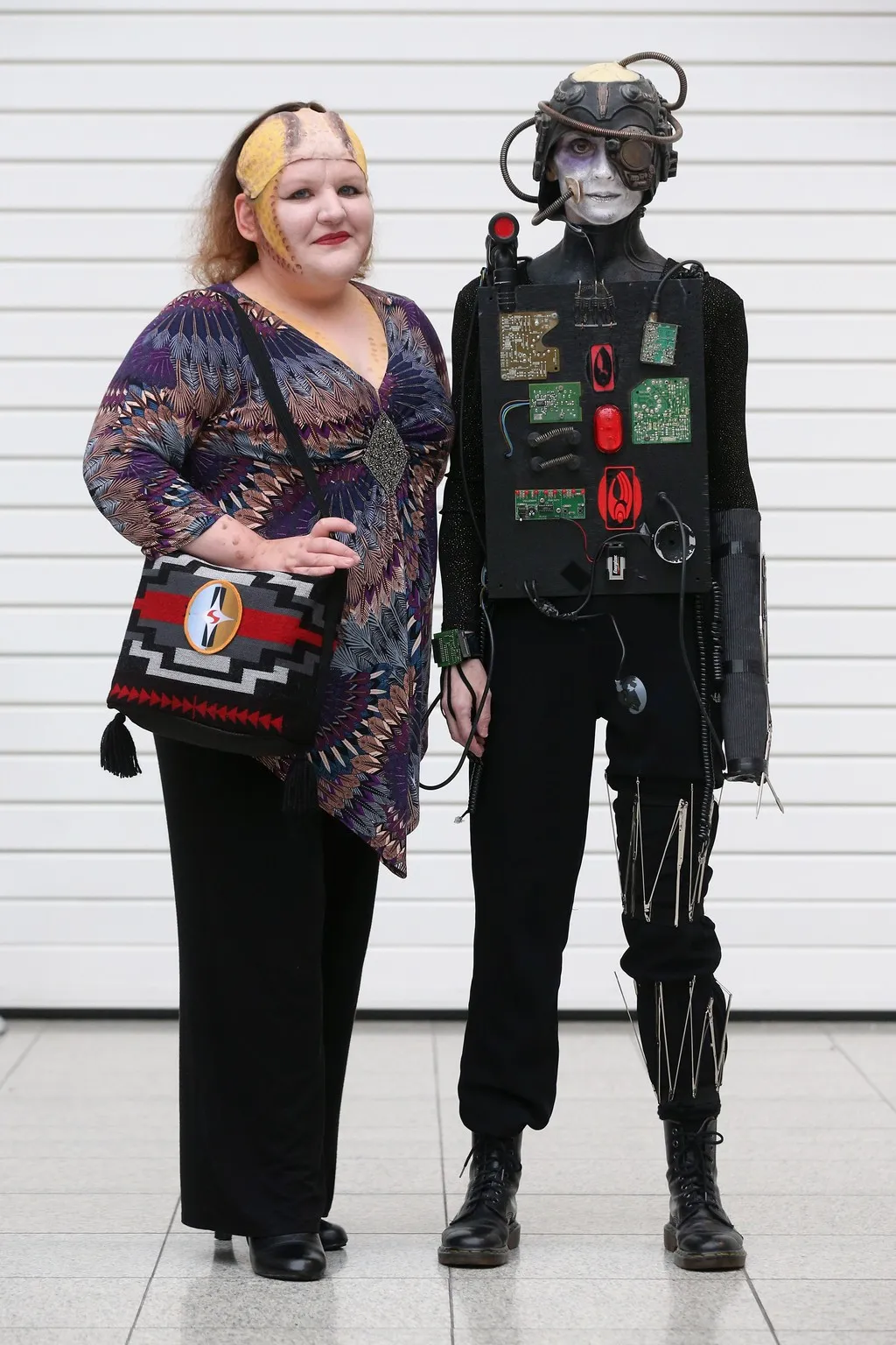 LONDON, ENGLAND - OCTOBER 19: Lou of Borg (R) and Lexica of Talax arrive to attend the 'Destination Star Trek London' convention at the ExCeL centre on October 19, 2012 in London, England. The three-day convention, which opened to the general public today, will be attended by all five actors who played captains throughout the 46-year-old series. (Photo by Oli Scarff/Getty Images)