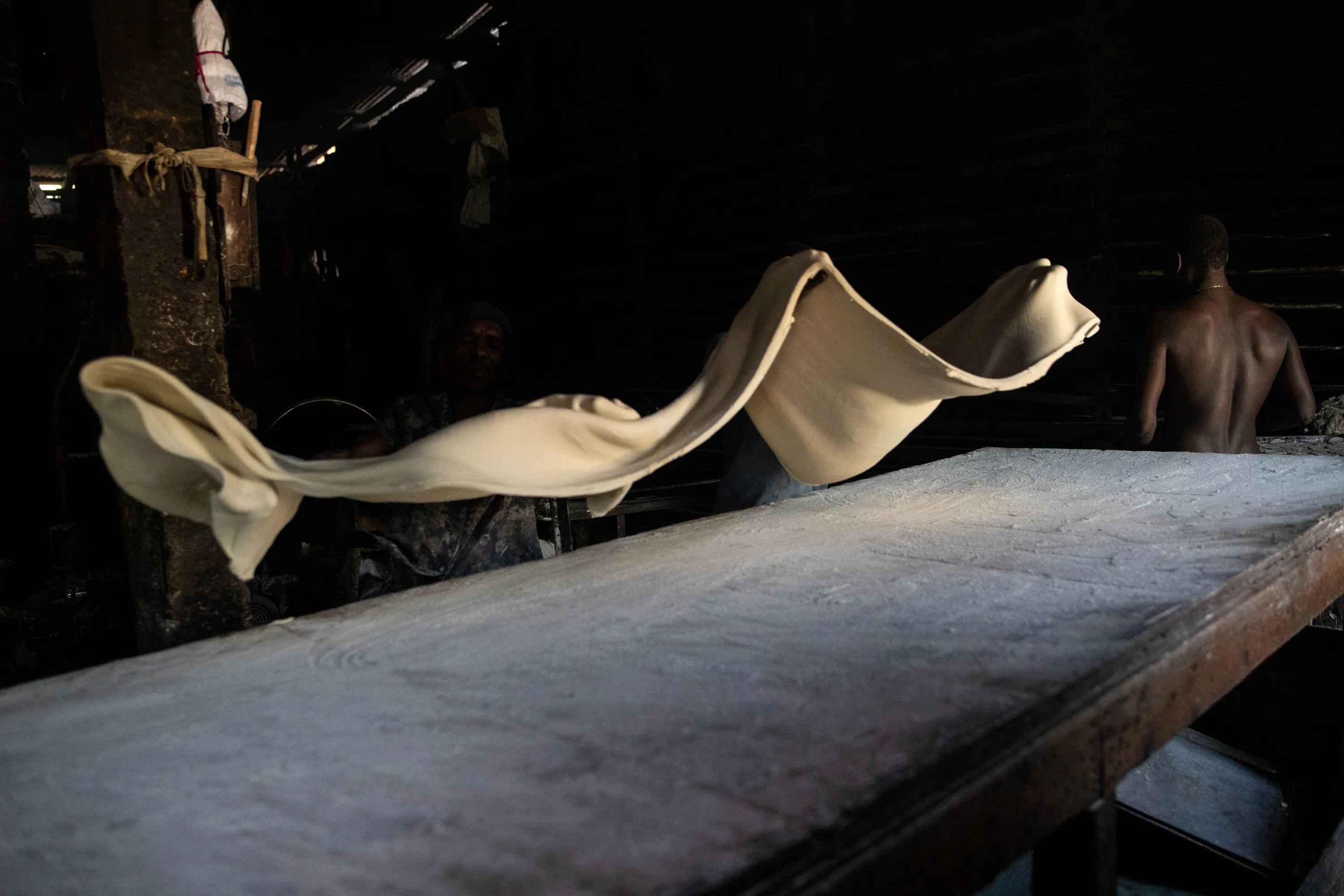 Workers carry dough to make bread inside the Bongu bakery in the Bel Air neighborhood of Port-au-Prince, Haiti, Monday, September 27, 2021. (Photo by Rodrigo Abd/AP Photo)