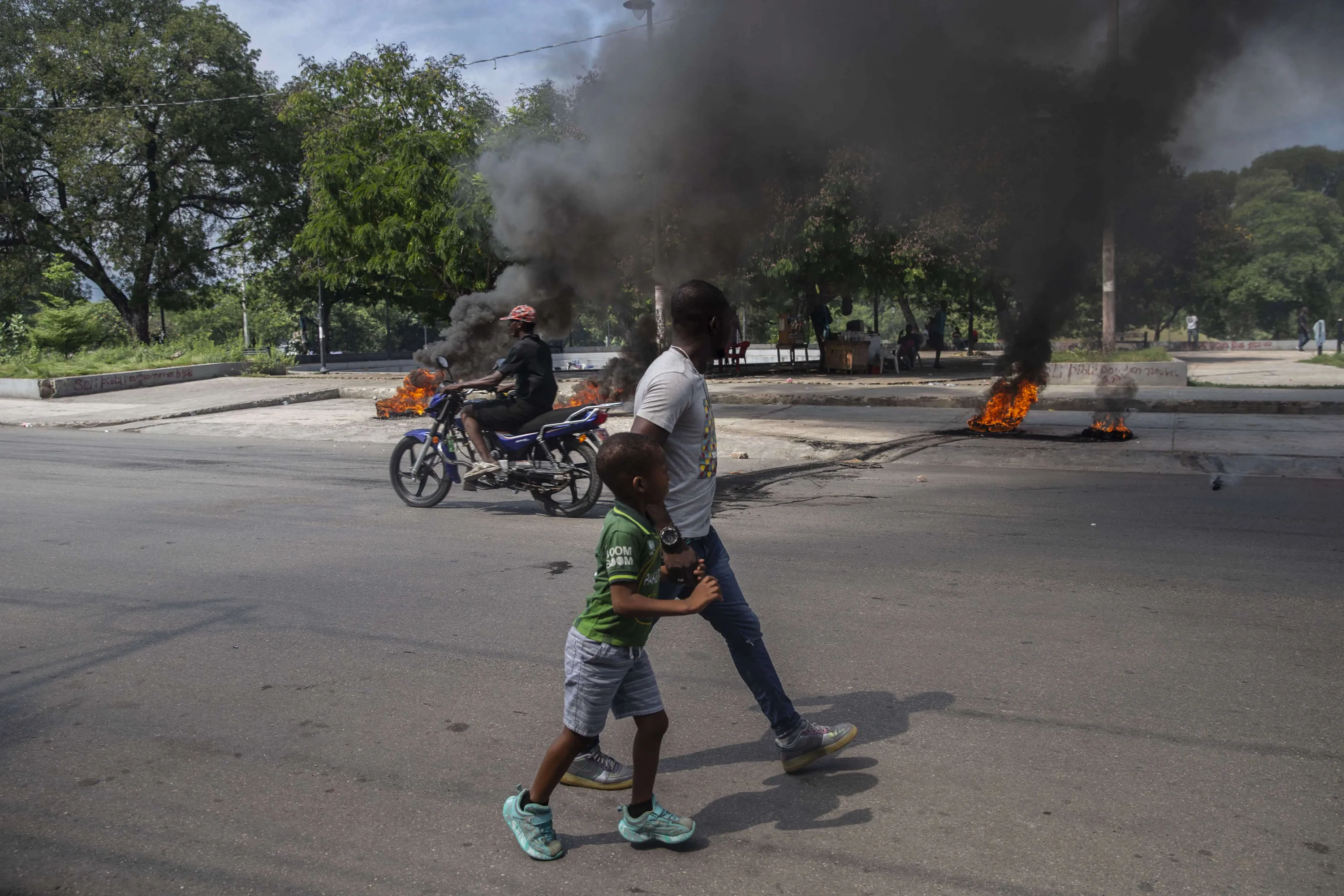 A man and a child walk by burning tires on a street in Port-au-Prince, Haiti, Sunday, October 17, 2021. (Photo by Joseph Odelyn/AP Photo)