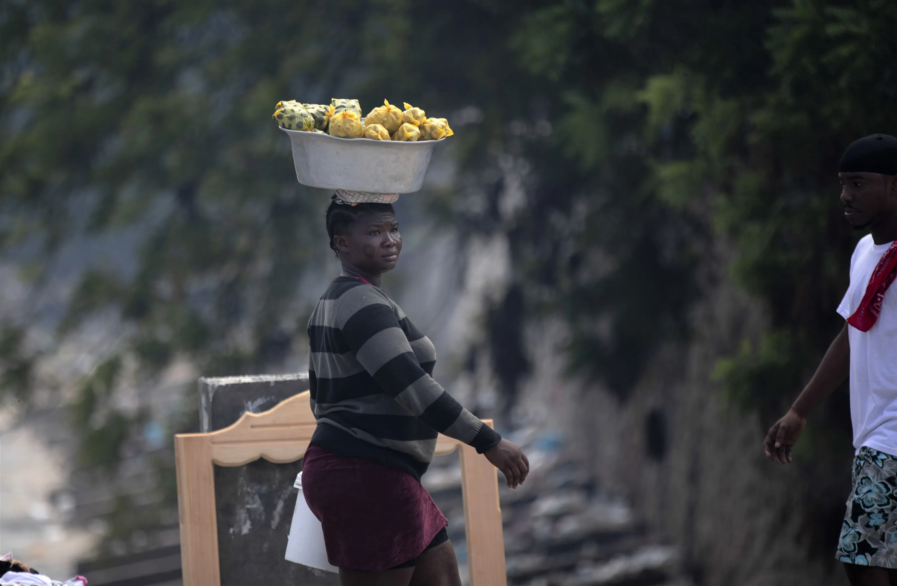 A street vendor walks with her merchandise on her head in Port-au-Prince, Haiti, Sunday, October 17, 2021. (Photo by Joseph Odelyn/AP Photo)